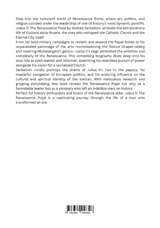 Step into the turbulent world of Renaissance Rome, where art, politics, and religion collided under the leadership of one of history's most dynamic pontiffs. Julius II: The Renaissance Pope by Andrea Serbelloni unravels the extraordinary life of Giuliano della Rovere, the man who reshaped the Catholic Church and the Eternal City itself.From his bold military campaigns to reclaim and expand the Papal States to his unparalleled patronage of the arts-commissioning the Sistine Chapel ceiling and inspiring Michelangelo's genius-Julius II's reign embodied the ambition and complexity of the Renaissance. This compelling biography dives deep into his dual role as both warrior and reformer, examining his relentless pursuit of power alongside his vision for a revitalized Church.Serbelloni vividly portrays the drama of Julius II's rise to the papacy, his masterful navigation of European politics, and his enduring influence on the cultural and spiritual identity of the Vatican. With meticulous research and gripping storytelling, this book reveals the Renaissance Pope not only as a formidable leader but as a visionary who left an indelible mark on history.Perfect for history enthusiasts and lovers of the Renaissance alike, Julius II: The Renais-sance Pope is a captivating journey through the life of a man who transformed an era.