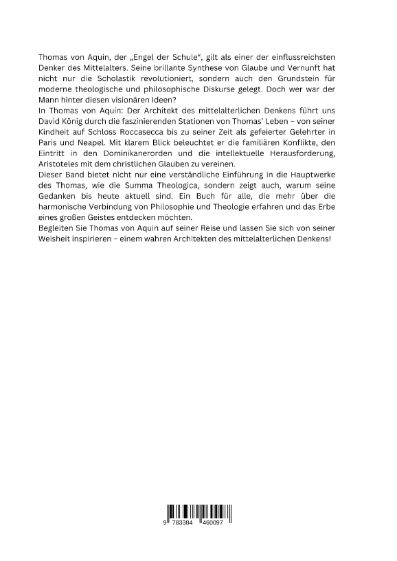 Thomas von Aquin, der "Engel der Schule", gilt als einer der einflussreichsten Denker des Mittelalters. Seine brillante Synthese von Glaube und Vernunft hat nicht nur die Scholastik revolutioniert, sondern auch den Grundstein für moderne theologische und philosophische Diskurse gelegt. Doch wer war der Mann hinter diesen visionären Ideen?In Thomas von Aquin: Der Architekt des mittelalterlichen Denkens führt uns David König durch die faszinierenden Stationen von Thomas' Leben - von seiner Kindheit auf Schloss Roccasecca bis zu seiner Zeit als gefeierter Gelehrter in Paris und Neapel. Mit klarem Blick beleuchtet er die familiären Konflikte, den Eintritt in den Dominikanerorden und die intellektuelle Herausforderung, Aristoteles mit dem christlichen Glauben zu vereinen.Dieser Band bietet nicht nur eine verständliche Einführung in die Hauptwerke des Thomas, wie die Summa Theologica, sondern zeigt auch, warum seine Gedanken bis heute aktuell sind. Ein Buch für alle, die mehr über die harmonische Verbindung von Philosophie und Theologie erfahren und das Erbe eines großen Geistes entdecken möchten.Begleiten Sie Thomas von Aquin auf seiner Reise und lassen Sie sich von seiner Weisheit inspirieren - einem wahren Architekten des mittelalterlichen Denkens!