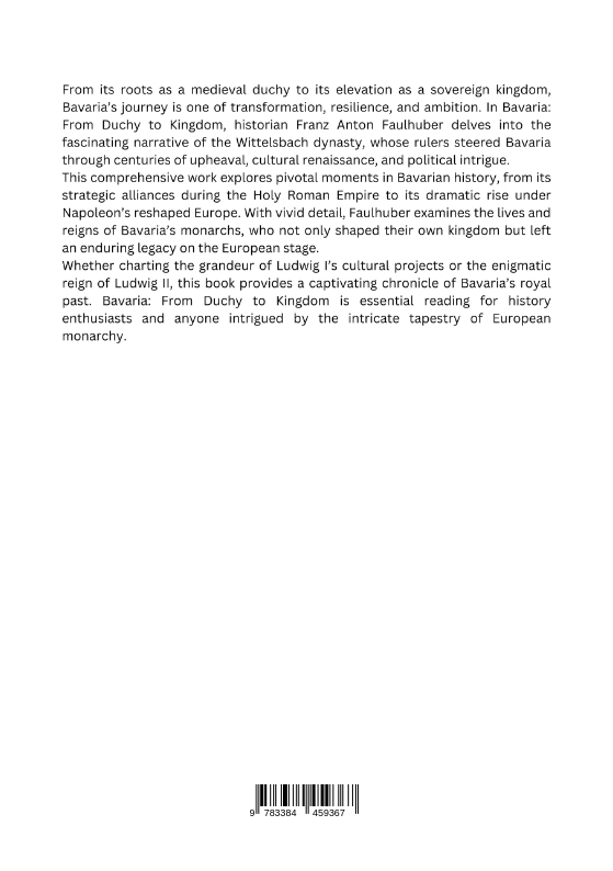 From its roots as a medieval duchy to its elevation as a sovereign kingdom, Bavaria's journey is one of transformation, resilience, and ambition. In Bavaria: From Duchy to Kingdom, historian Franz Anton Faulhuber delves into the fascinating narrative of the Wittelsbach dynasty, whose rulers steered Bavaria through centuries of upheaval, cul-tural renaissance, and political intrigue.This comprehensive work explores pivotal moments in Bavarian history, from its strategic alliances during the Holy Roman Empire to its dramatic rise under Napoleon's reshaped Europe. With vivid detail, Faulhuber examines the lives and reigns of Bavaria's monarchs, who not only shaped their own kingdom but left an enduring legacy on the European stage.Whether charting the grandeur of Ludwig I's cultural projects or the enigmatic reign of Ludwig II, this book provides a captivating chronicle of Bavaria's royal past. Bavaria: From Duchy to Kingdom is essential reading for history enthusiasts and anyone in-trigued by the intricate tapestry of European monarchy.