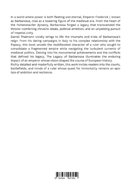 In a world where power is both fleeting and eternal, Emperor Frederick I, known as Bar-barossa, rose as a towering figure of the medieval era. From the heart of the Hohenstau-fen dynasty, Barbarossa forged a legacy that transcended the throne-combining chival-ric ideals, political ambition, and an unyielding pursuit of imperial unity.Daniel Thalmann vividly brings to life the triumphs and trials of Barbarossa's reign. From his daring campaigns in Italy to his complex relationship with the Papacy, this book un-veils the multifaceted character of a ruler who sought to consolidate a fragmented em-pire while navigating the turbulent currents of medieval politics. Delving into his monu-mental achievements and the conflicts that defined his legacy, The Legacy of Barbaros-sa illuminates the enduring impact of an emperor whose vision shaped the course of European history.Richly detailed and masterfully written, this work invites readers into the courts, battle-fields, and minds of a ruler whose quest for immortality remains an epic tale of ambition and resilience.