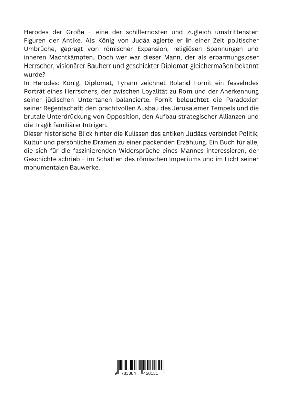 Herodes der Große - eine der schillerndsten und zugleich umstrittensten Figuren der An-tike. Als König von Judäa agierte er in einer Zeit politischer Umbrüche, geprägt von römi-scher Expansion, religiösen Spannungen und inneren Machtkämpfen. Doch wer war dieser Mann, der als erbarmungsloser Herrscher, visionärer Bauherr und geschickter Diplomat gleichermaßen bekannt wurde?In Herodes: König, Diplomat, Tyrann zeichnet Roland Fornit ein fesselndes Porträt eines Herrschers, der zwischen Loyalität zu Rom und der Anerkennung seiner jüdischen Unter-tanen balancierte. Fornit beleuchtet die Paradoxien seiner Regentschaft: den prachtvol-len Ausbau des Jerusalemer Tempels und die brutale Unterdrückung von Opposition, den Aufbau strategischer Allianzen und die Tragik familiärer Intrigen.Dieser historische Blick hinter die Kulissen des antiken Judäas verbindet Politik, Kultur und persönliche Dramen zu einer packenden Erzählung. Ein Buch für alle, die sich für die faszinierenden Widersprüche eines Mannes interessieren, der Geschichte schrieb - im Schatten des römischen Imperiums und im Licht seiner monumentalen Bauwerke.