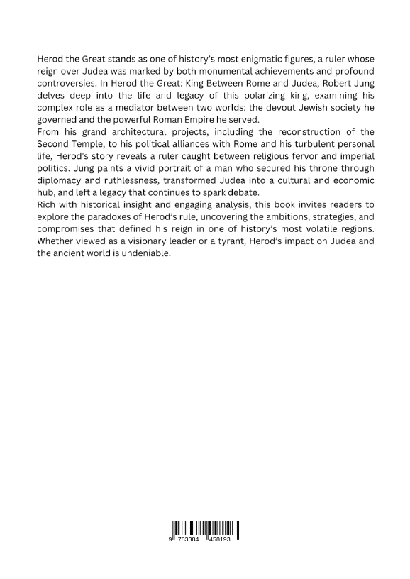 Herod the Great stands as one of history's most enigmatic figures, a ruler whose reign over Judea was marked by both monumental achievements and profound controversies. In Herod the Great: King Between Rome and Judea, Robert Jung delves deep into the life and legacy of this polarizing king, examining his complex role as a mediator between two worlds: the devout Jewish society he governed and the powerful Roman Empire he served.From his grand architectural projects, including the reconstruction of the Second Temple, to his political alliances with Rome and his turbulent personal life, Herod's story reveals a ruler caught between religious fervor and imperial politics. Jung paints a vivid portrait of a man who secured his throne through diplomacy and ruthlessness, trans-formed Judea into a cultural and economic hub, and left a legacy that continues to spark debate.Rich with historical insight and engaging analysis, this book invites readers to explore the paradoxes of Herod's rule, uncovering the ambitions, strategies, and compromises that defined his reign in one of history's most volatile regions. Whether viewed as a vi-sionary leader or a tyrant, Herod's impact on Judea and the ancient world is undeniable.