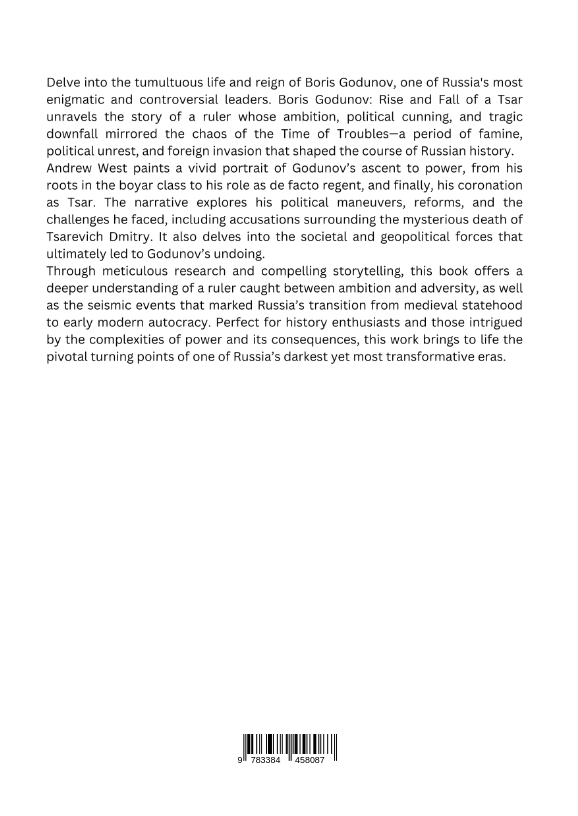 Delve into the tumultuous life and reign of Boris Godunov, one of Russia's most enigmat-ic and controversial leaders. Boris Godunov: Rise and Fall of a Tsar unravels the story of a ruler whose ambition, political cunning, and tragic downfall mirrored the chaos of the Time of Troubles-a period of famine, political unrest, and foreign invasion that shaped the course of Russian history.Andrew West paints a vivid portrait of Godunov's ascent to power, from his roots in the boyar class to his role as de facto regent, and finally, his coronation as Tsar. The narra-tive explores his political maneuvers, reforms, and the challenges he faced, including accusations surrounding the mysterious death of Tsarevich Dmitry. It also delves into the societal and geopolitical forces that ultimately led to Godunov's undoing.Through meticulous research and compelling storytelling, this book offers a deeper un-derstanding of a ruler caught between ambition and adversity, as well as the seismic events that marked Russia's transition from medieval statehood to early modern autoc-racy. Perfect for history enthusiasts and those intrigued by the complexities of power and its consequences, this work brings to life the pivotal turning points of one of Russia's darkest yet most transformative eras.