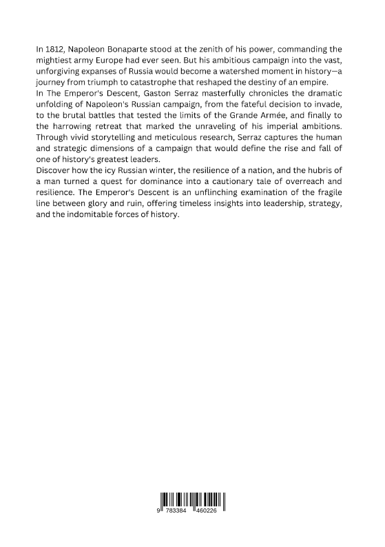 In 1812, Napoleon Bonaparte stood at the zenith of his power, commanding the mightiest army Europe had ever seen. But his ambitious campaign into the vast, unforgiving expanses of Russia would become a watershed moment in history-a journey from tri-umph to catastrophe that reshaped the destiny of an empire.In The Emperor's Descent, Gaston Serraz masterfully chronicles the dramatic unfolding of Napoleon's Russian campaign, from the fateful decision to invade, to the brutal battles that tested the limits of the Grande Armée, and finally to the harrowing retreat that marked the unraveling of his imperial ambitions. Through vivid storytelling and meticulous research, Serraz captures the human and strategic dimensions of a campaign that would define the rise and fall of one of history's greatest leaders.Discover how the icy Russian winter, the resilience of a nation, and the hubris of a man turned a quest for dominance into a cautionary tale of overreach and resilience. The Emperor's Descent is an unflinching examination of the fragile line between glory and ruin, offering timeless insights into leadership, strategy, and the indomitable forces of history.