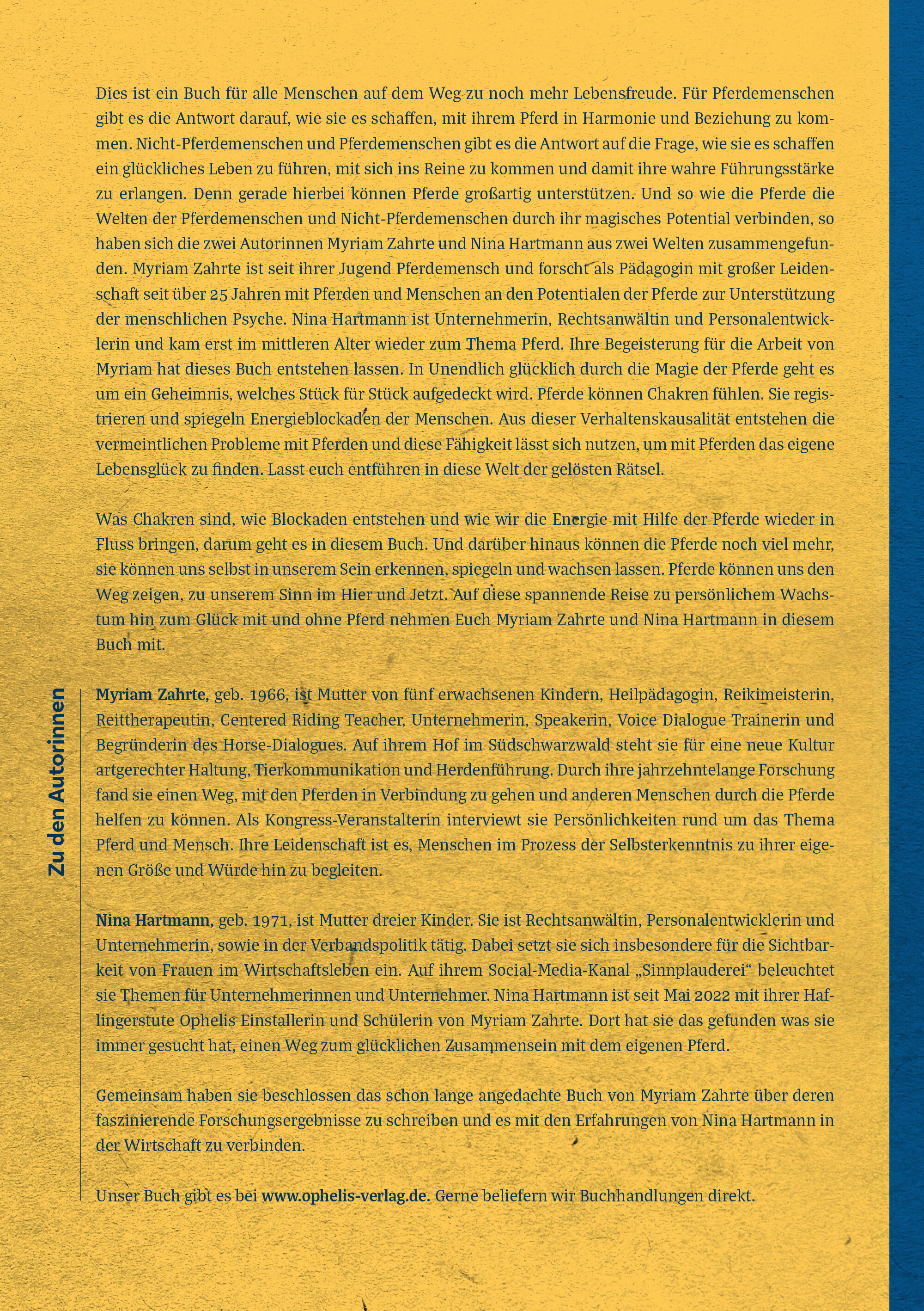 Viele Menschen suchen im Zusammensein mit Pferden mehr als eine Stunde Reiten am Tag. Es geht mehr um Verbindung, Verständnis, Nähe und Freude. Die Die Rolle der Pferde hat sich verändert, vom Nutztier zum Sport- oder Freizeitpartner. In den Ställen sieht man selten freudestrahlenden Menschen mit Leichtigkeit und spielerischer Harmonie. Neben den finanziellen und zeitlichen Belastungen scheint auch die gemeinsame Zeit mehr von unerreichten Zielen, denn vom Glücklich-Sein im Hier und Jetzt geprägt zu sein. Woher kommt das und was können wir anders machen? Darauf gibt dieses Buch eine Antwort. Zum Reflektieren, selbst Umsetzen und Glücklich-Sein! Dieses Buch ist die Erkenntnis nach 25 Jahren Forschung durch Myriam Zahrte. Es löst den Schmerzpunkt, den so gut wie alle Pferdemenschen kennen. Die Antwort auf die Frage, wie man es schafft, mit dem Pferd eine echte Verbindung herzustellen und wie man den Grundstein legt, damit Pferde gerne mit uns zusammen sind. Die Antwort ist ganz einfach. Pferde können Chakren fühlen. Sie registrieren und spiegeln Energieblockaden der Menschen. Was Chakren sind, wie Blockaden entstehen und wie wir die Energie mit Hilfe der Pferde wieder in Fluss bringen, darum geht es in diesem Buch. Und darüber hinaus können die Pferde noch viel mehr, sie können uns selbst in unserem Sein erkennen, spiegeln und wachsen lassen. Pferde können uns den Weg zeigen, zu unserem Sinn im Hier und Jetzt. diese spannende Reise zu unserem persönlichen Wachstum hin zum Glück mit und ohne Pferd nehmen Euch Myriam Zahrte und Nina Hartmann in diesem Buch mit.