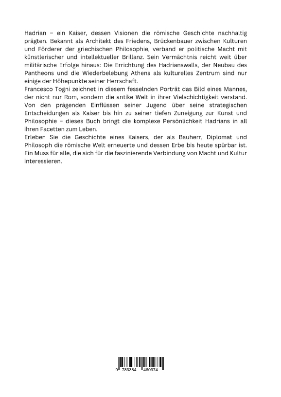 Hadrian - ein Kaiser, dessen Visionen die römische Geschichte nachhaltig prägten. Bekannt als Architekt des Friedens, Brückenbauer zwischen Kulturen und Förderer der griechischen Philosophie, verband er politische Macht mit künstlerischer und intellektueller Brillanz. Sein Vermächtnis reicht weit über militärische Erfolge hinaus: Die Errichtung des Hadrianswalls, der Neubau des Pantheons und die Wiederbelebung Athens als kulturelles Zentrum sind nur einige der Höhepunkte seiner Herrschaft.Francesco Togni zeichnet in diesem fesselnden Porträt das Bild eines Mannes, der nicht nur Rom, sondern die antike Welt in ihrer Vielschichtigkeit verstand. Von den prägenden Einflüssen seiner Jugend über seine strategischen Entscheidungen als Kaiser bis hin zu seiner tiefen Zuneigung zur Kunst und Philosophie - dieses Buch bringt die komplexe Persönlichkeit Hadrians in all ihren Facetten zum Leben.Erleben Sie die Geschichte eines Kaisers, der als Bauherr, Diplomat und Philosoph die römische Welt erneuerte und dessen Erbe bis heute spürbar ist. Ein Muss für alle, die sich für die faszinierende Verbindung von Macht und Kultur interessieren.