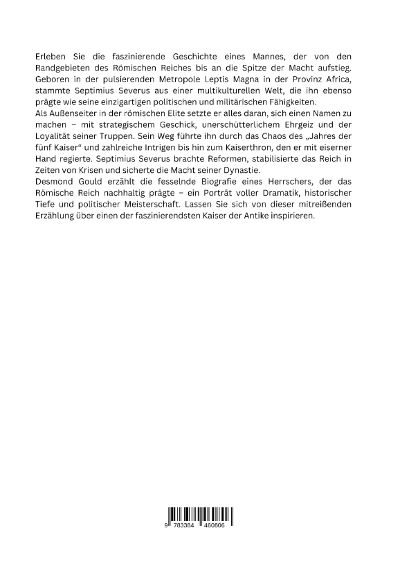 Erleben Sie die faszinierende Geschichte eines Mannes, der von den Randgebieten des Römischen Reiches bis an die Spitze der Macht aufstieg. Geboren in der pulsierenden Metropole Leptis Magna in der Provinz Africa, stammte Septimius Severus aus einer multikulturellen Welt, die ihn ebenso prägte wie seine einzigartigen politischen und militärischen Fähigkeiten.Als Außenseiter in der römischen Elite setzte er alles daran, sich einen Namen zu machen - mit strategischem Geschick, unerschütterlichem Ehrgeiz und der Loyalität seiner Truppen. Sein Weg führte ihn durch das Chaos des "Jahres der fünf Kaiser" und zahlreiche Intrigen bis hin zum Kaiserthron, den er mit eiserner Hand regierte. Septimius Severus brachte Reformen, stabilisierte das Reich in Zeiten von Krisen und sicherte die Macht seiner Dynastie.Desmond Gould erzählt die fesselnde Biografie eines Herrschers, der das Römische Reich nachhaltig prägte - ein Porträt voller Dramatik, historischer Tiefe und politischer Meisterschaft. Lassen Sie sich von dieser mitreißenden Erzählung über einen der faszinierendsten Kaiser der Antike inspirieren.