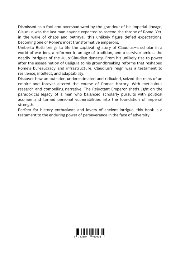 Dismissed as a fool and overshadowed by the grandeur of his imperial lineage, Claudius was the last man anyone expected to ascend the throne of Rome. Yet, in the wake of chaos and betrayal, this unlikely figure defied expectations, becoming one of Rome's most transformative emperors.Umberto Botti brings to life the captivating story of Claudius-a scholar in a world of warriors, a reformer in an age of tradition, and a survivor amidst the deadly intrigues of the Julio-Claudian dynasty. From his unlikely rise to power after the assassination of Caligula to his groundbreaking reforms that reshaped Rome's bureaucracy and infrastruc-ture, Claudius's reign was a testament to resilience, intellect, and adaptability.Discover how an outsider, underestimated and ridiculed, seized the reins of an empire and forever altered the course of Roman history. With meticulous research and compelling narrative, The Reluctant Emperor sheds light on the paradoxical legacy of a man who balanced scholarly pursuits with political acumen and turned personal vulnerabilities into the foundation of imperial strength.Perfect for history enthusiasts and lovers of ancient intrigue, this book is a testament to the enduring power of perseverance in the face of adversity.
