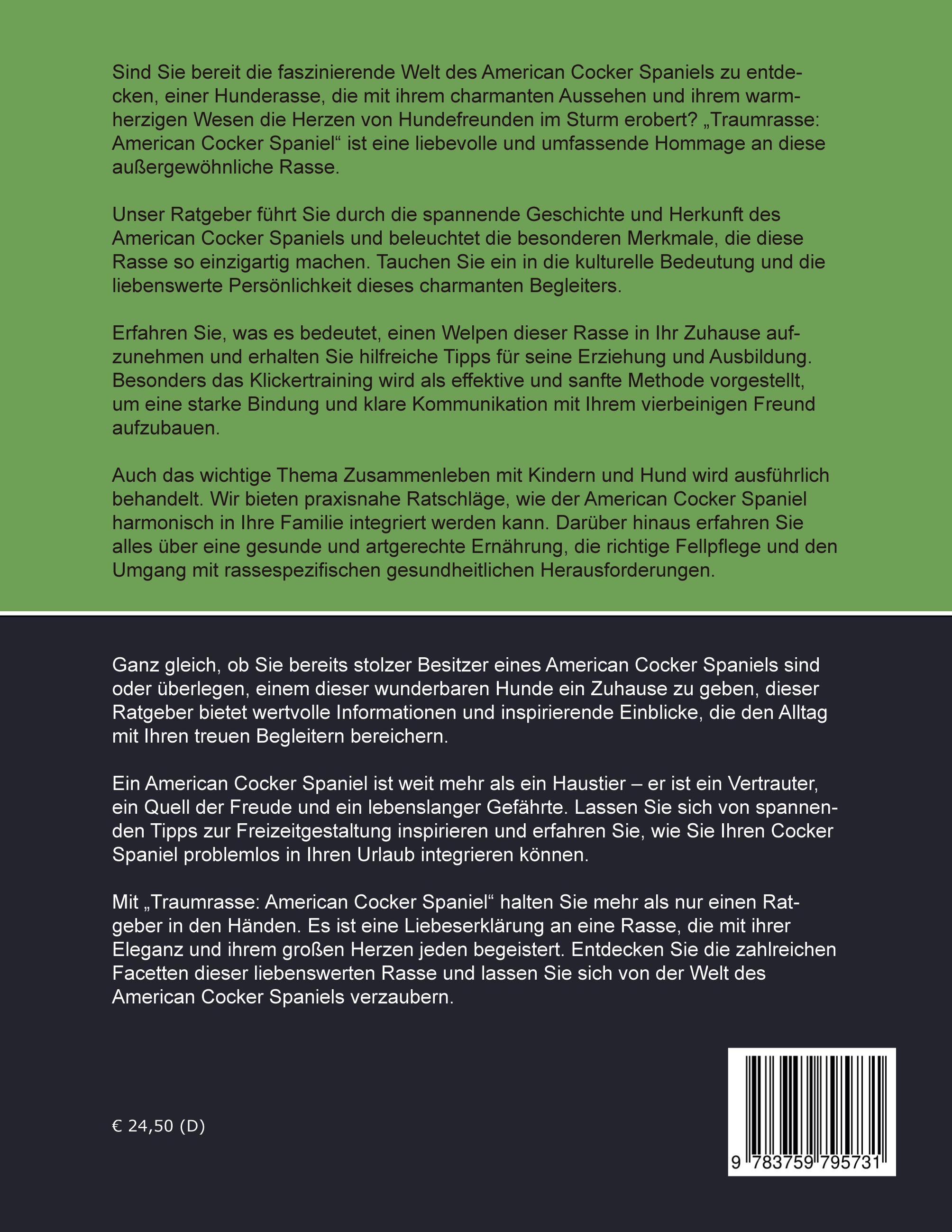 Auch das wichtige Thema Zusammenleben mit Kindern und Hund wird ausführlich behandelt. Wir bieten praxisnahe Ratschläge, wie der American Cocker Spaniel harmonisch in Ihre Familie integriert werden kann. Darüber hinaus erfahren Sie alles über eine gesunde und artgerechte Ernährung, die richtige Fellpflege und den Umgang mit rassespezifischen gesundheitlichen Herausforderungen.
