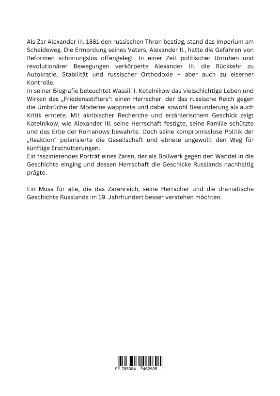 Als Zar Alexander III. 1881 den russischen Thron bestieg, stand das Imperium am Scheideweg. Die Ermordung seines Vaters, Alexander II., hatte die Gefahren von Reformen schonungslos offengelegt. In einer Zeit politischer Unruhen und revolutionärer Bewegungen verkörperte Alexander III. die Rückkehr zu Autokratie, Stabilität und russischer Orthodoxie - aber auch zu eiserner Kontrolle.In seiner Biografie beleuchtet Wassili I. Kotelnikow das vielschichtige Leben und Wirken des "Friedensstifters": einen Herrscher, der das russische Reich gegen die Umbrüche der Moderne wappnete und dabei sowohl Bewunderung als auch Kritik erntete. Mit akribischer Recherche und erzählerischem Geschick zeigt Kotelnikow, wie Alexander III. seine Herrschaft festigte, seine Familie schützte und das Erbe der Romanows bewahrte. Doch seine kompromisslose Politik der "Reaktion" polarisierte die Gesellschaft und ebnete ungewollt den Weg für künftige Erschütterungen.Ein faszinierendes Porträt eines Zaren, der als Bollwerk gegen den Wandel in die Geschichte einging und dessen Herrschaft die Geschicke Russlands nachhaltig prägte.Ein Muss für alle, die das Zarenreich, seine Herrscher und die dramatische Geschichte Russlands im 19. Jahrhundert besser verstehen möchten.