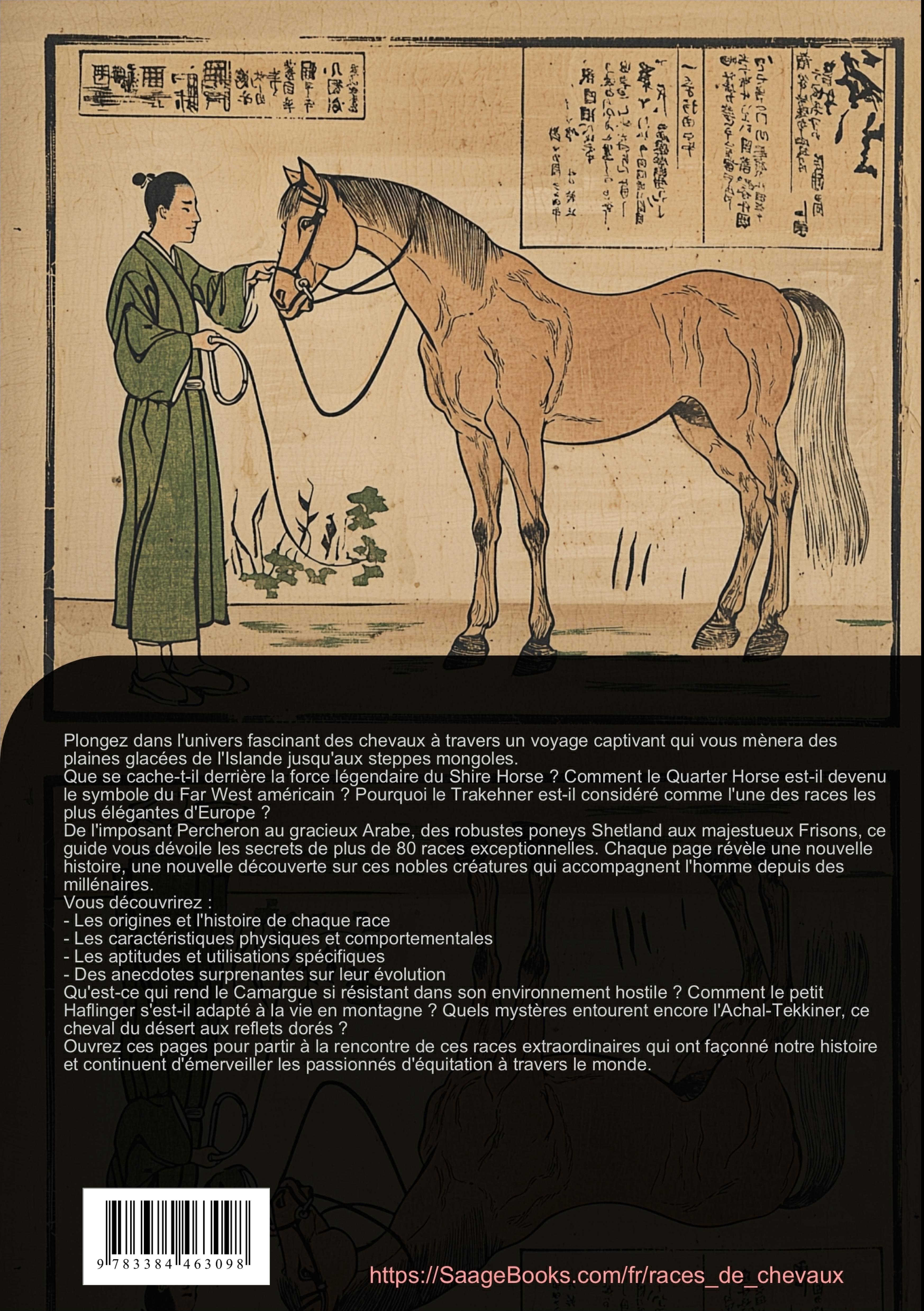 Plongez dans l'univers fascinant des races de chevaux avec ce guide détaillé qui présente plus de 80 races exceptionnelles du monde entier.Ce livre sur les chevaux offre une exploration approfondie des différentes races, organisée en sections géographiques distinctes :- Les races européennes, incluant les prestigieux chevaux allemands comme le Holsteiner et le Trakehner, les robustes chevaux britanniques comme le Shire Horse, et les élégantes races françaises comme le Percheron et le Camargue- Les races américaines, présentant les célèbres Quarter Horse et Appaloosa d'Amérique du Nord, ainsi que les races sud-américaines comme le Criollo et le Paso Fino- Les races asiatiques, mettant en valeur le raffinement de l'Arabe pur-sang et la résistance du cheval mongol- Une section complète dédiée aux poneys, des robustes Shetland aux polyvalents Welsh PoniesChaque race est présentée avec :- Ses caractéristiques physiques distinctives- Son histoire et ses origines- Ses aptitudes et utilisations principales- Ses traits de caractère- Ses besoins spécifiques en matière d'élevageQue vous soyez passionné d'équitation, éleveur, ou simplement curieux de découvrir la diversité des chevaux et poneys, ce livre sur les races de chevaux vous accompagnera dans votre découverte du monde équestre.Richement illustré de photographies en couleur, cet ouvrage constitue une référence pratique pour comprendre et apprécier les nombreuses races qui font la richesse du patrimoine équin mondial.Ce livre a été créé en utilisant des technologies innovantes telles que l'Intelligence Artificielle ainsi que des outils spécialement développés - par exemple, pour la recherche d'idées, la recherche d'informations, l'écriture, la relecture, l'assurance qualité et la conception d'illustrations décoratives.