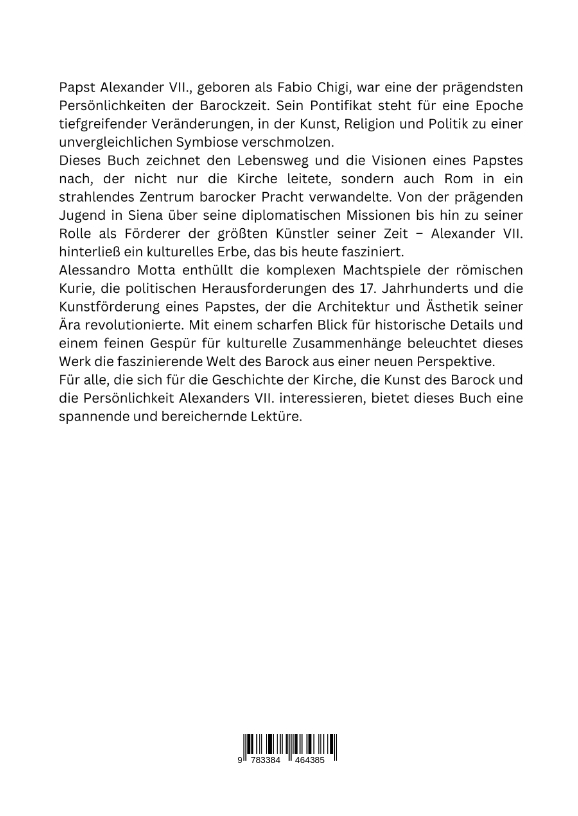 Papst Alexander VII., geboren als Fabio Chigi, war eine der prägendsten Persönlichkeiten der Barockzeit. Sein Pontifikat steht für eine Epoche tiefgreifender Veränderungen, in der Kunst, Religion und Politik zu einer unvergleichlichen Symbiose verschmolzen.Dieses Buch zeichnet den Lebensweg und die Visionen eines Papstes nach, der nicht nur die Kirche leitete, sondern auch Rom in ein strahlendes Zentrum barocker Pracht verwandelte. Von der prägenden Jugend in Siena über seine diplomatischen Missionen bis hin zu seiner Rolle als Förderer der größten Künstler seiner Zeit - Alexander VII. hinterließ ein kulturelles Erbe, das bis heute fasziniert.Alessandro Motta enthüllt die komplexen Machtspiele der römischen Kurie, die politischen Herausforderungen des 17. Jahrhunderts und die Kunstförderung eines Papstes, der die Architektur und Ästhetik seiner Ära revolutionierte. Mit einem scharfen Blick für historische Details und einem feinen Gespür für kulturelle Zusammenhänge beleuchtet dieses Werk die faszinierende Welt des Barock aus einer neuen Perspektive.Für alle, die sich für die Geschichte der Kirche, die Kunst des Barock und die Persönlichkeit Alexanders VII. interessieren, bietet dieses Buch eine spannende und bereichernde Lektüre.