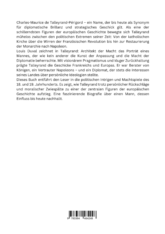 Charles-Maurice de Talleyrand-Périgord - ein Name, der bis heute als Synonym für diplomatische Brillanz und strategisches Geschick gilt. Als eine der schillerndsten Figuren der europäischen Geschichte bewegte sich Talleyrand mühelos zwischen den politischen Extremen seiner Zeit: Von der katholischen Kirche über die Wirren der Französischen Revolution bis hin zur Restaurierung der Monarchie nach Napoleon.Louis Duval zeichnet in Talleyrand: Architekt der Macht das Porträt eines Mannes, der wie kein anderer die Kunst der Anpassung und die Macht der Diplomatie beherrschte. Mit visionärem Pragmatismus und kluger Zurückhaltung prägte Talleyrand die Geschicke Frankreichs und Europas. Er war Berater von Königen, ein Vertrauter Napoleons - und ein Diplomat, der stets die Interessen seines Landes über persönliche Ideologien stellte.Dieses Buch entführt den Leser in die politischen Intrigen und Machtspiele des 18. und 19. Jahrhunderts. Es zeigt, wie Talleyrand trotz persönlicher Rückschläge und moralischer Zwiespälte zu einer der zentralen Figuren der europäischen Geschichte aufstieg. Eine faszinierende Biografie über einen Mann, dessen Einfluss bis heute nachhallt.