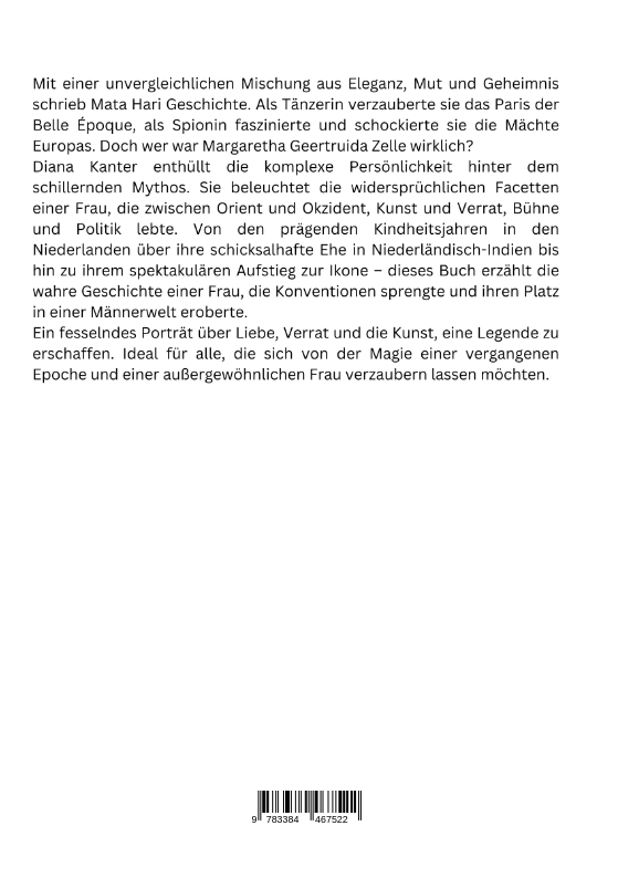 Mit einer unvergleichlichen Mischung aus Eleganz, Mut und Geheimnis schrieb Mata Hari Geschichte. Als Tänzerin verzauberte sie das Paris der Belle Époque, als Spionin faszinierte und schockierte sie die Mächte Europas. Doch wer war Margaretha Geertruida Zelle wirklich?Diana Kanter enthüllt die komplexe Persönlichkeit hinter dem schillernden Mythos. Sie beleuchtet die widersprüchlichen Facetten einer Frau, die zwischen Orient und Okzident, Kunst und Verrat, Bühne und Politik lebte. Von den prägenden Kindheitsjahren in den Niederlanden über ihre schicksalhafte Ehe in Niederländisch-Indien bis hin zu ihrem spektakulären Aufstieg zur Ikone - dieses Buch erzählt die wahre Geschichte einer Frau, die Konventionen sprengte und ihren Platz in einer Männerwelt eroberte.Ein fesselndes Porträt über Liebe, Verrat und die Kunst, eine Legende zu erschaffen. Ideal für alle, die sich von der Magie einer vergangenen Epoche und einer außergewöhnlichen Frau verzaubern lassen möchten.