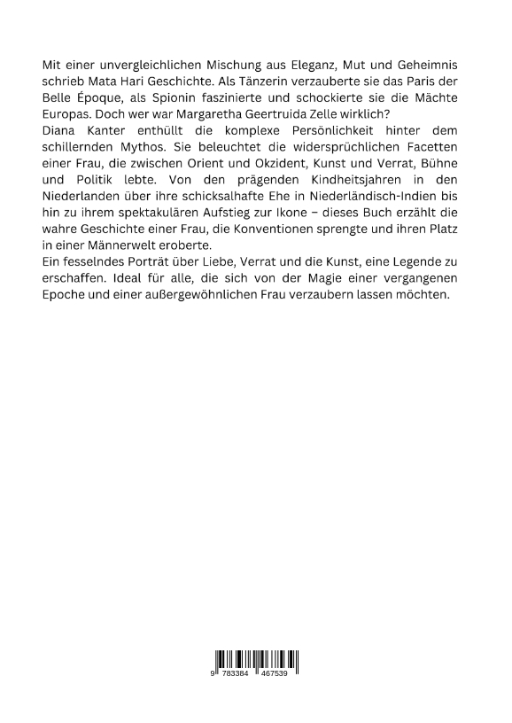 Mit einer unvergleichlichen Mischung aus Eleganz, Mut und Geheimnis schrieb Mata Hari Geschichte. Als Tänzerin verzauberte sie das Paris der Belle Époque, als Spionin faszinierte und schockierte sie die Mächte Europas. Doch wer war Margaretha Geertruida Zelle wirklich?Diana Kanter enthüllt die komplexe Persönlichkeit hinter dem schillernden Mythos. Sie beleuchtet die widersprüchlichen Facetten einer Frau, die zwischen Orient und Okzident, Kunst und Verrat, Bühne und Politik lebte. Von den prägenden Kindheitsjahren in den Niederlanden über ihre schicksalhafte Ehe in Niederländisch-Indien bis hin zu ihrem spektakulären Aufstieg zur Ikone - dieses Buch erzählt die wahre Geschichte einer Frau, die Konventionen sprengte und ihren Platz in einer Männerwelt eroberte.Ein fesselndes Porträt über Liebe, Verrat und die Kunst, eine Legende zu erschaffen. Ideal für alle, die sich von der Magie einer vergangenen Epoche und einer außergewöhnlichen Frau verzaubern lassen möchten.