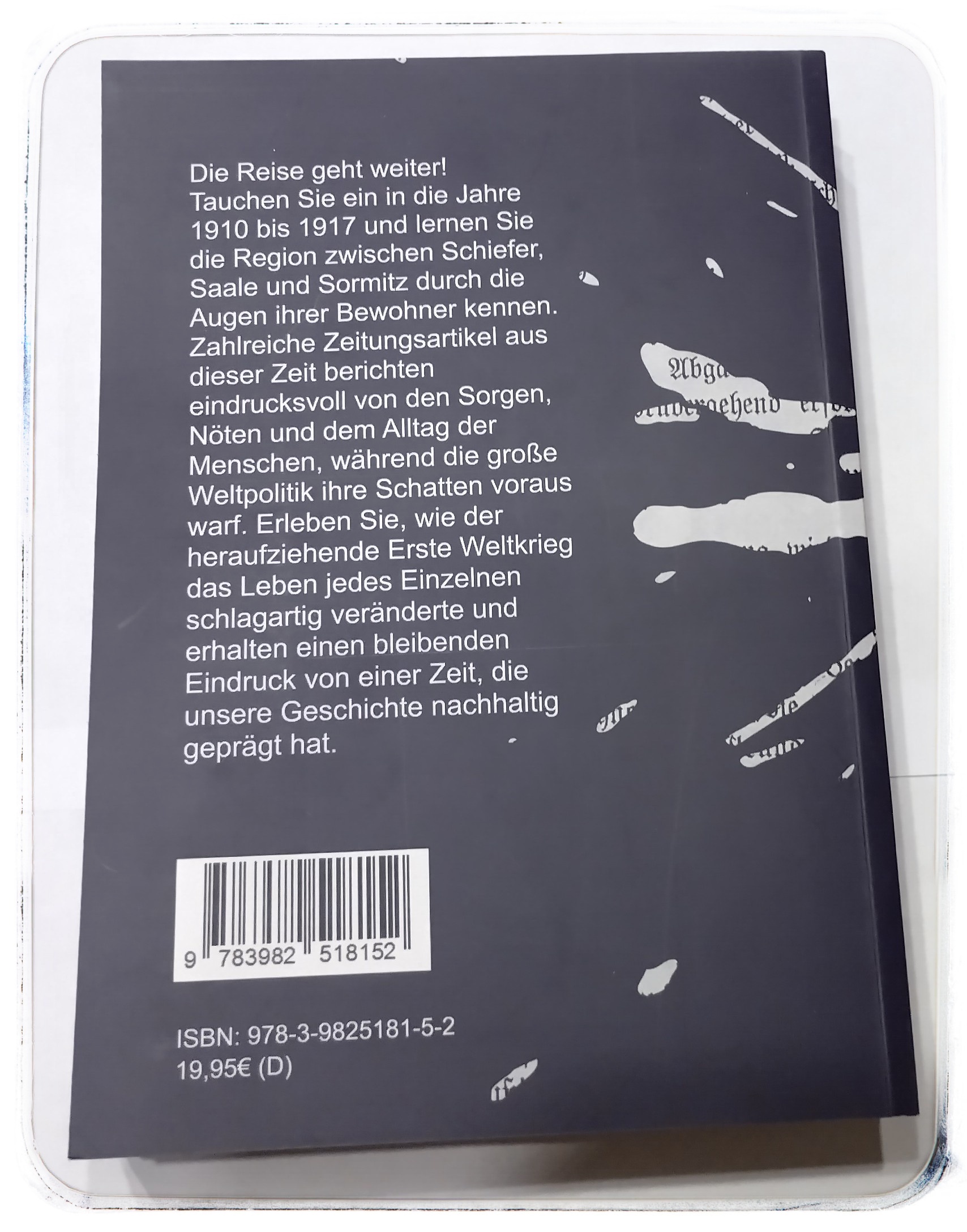 Tauchen Sie ein in die Jahre 1910 bis 1917 und lernen Sie die Region zwischen Schiefer, Saale und Sormitz durch die Augen ihrer Bewohner kennen. Zahlreiche Zeitungsartikel aus dieser Zeit berichten eindrucksvoll von den Sorgen, Nöten und dem Alltag der Menschen, während die große Weltpolitik ihre Schatten voraus warf. Erleben Sie, wie der heraufziehende Erste Weltkrieg das Leben jedes Einzelnen schlagartig veränderte und erhalten einen bleibenden Eindruck von einer Zeit, die unsere Geschichte nachhaltig geprägt hat.