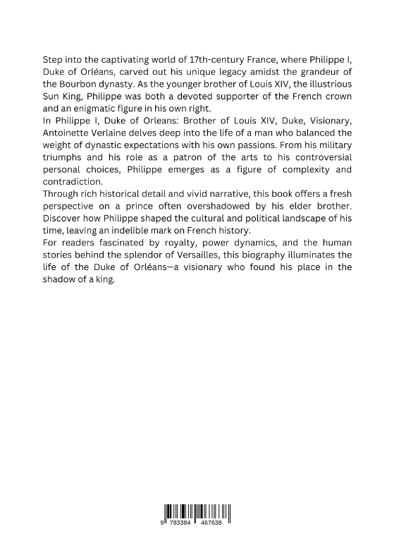 Step into the captivating world of 17th-century France, where Philippe I, Duke of Orléans, carved out his unique legacy amidst the grandeur of the Bourbon dynasty. As the younger brother of Louis XIV, the illustrious Sun King, Philippe was both a devoted supporter of the French crown and an enigmatic figure in his own right.In Philippe I, Duke of Orleans: Brother of Louis XIV, Duke, Visionary, Antoinette Verlaine delves deep into the life of a man who balanced the weight of dynastic expectations with his own passions. From his military triumphs and his role as a patron of the arts to his controversial personal choices, Philippe emerges as a figure of complexity and contra-diction.Through rich historical detail and vivid narrative, this book offers a fresh perspective on a prince often overshadowed by his elder brother. Discover how Philippe shaped the cultural and political landscape of his time, leaving an indelible mark on French history.For readers fascinated by royalty, power dynamics, and the human stories behind the splendor of Versailles, this biography illuminates the life of the Duke of Orléans-a visionary who found his place in the shadow of a king.