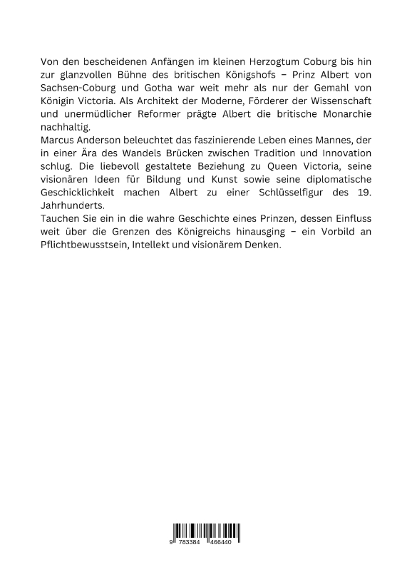 Von den bescheidenen Anfängen im kleinen Herzogtum Coburg bis hin zur glanzvollen Bühne des britischen Königshofs - Prinz Albert von Sachsen-Coburg und Gotha war weit mehr als nur der Gemahl von Königin Victoria. Als Architekt der Moderne, Förderer der Wissenschaft und unermüdlicher Reformer prägte Albert die britische Monarchie nach-haltig.Marcus Anderson beleuchtet das faszinierende Leben eines Mannes, der in einer Ära des Wandels Brücken zwischen Tradition und Innovation schlug. Die liebevoll gestaltete Beziehung zu Queen Victoria, seine visionären Ideen für Bildung und Kunst sowie seine diplomatische Geschicklichkeit machen Albert zu einer Schlüsselfigur des 19. Jahrhunderts.Tauchen Sie ein in die wahre Geschichte eines Prinzen, dessen Einfluss weit über die Grenzen des Königreichs hinausging - ein Vorbild an Pflichtbewusstsein, Intellekt und visionärem Denken.