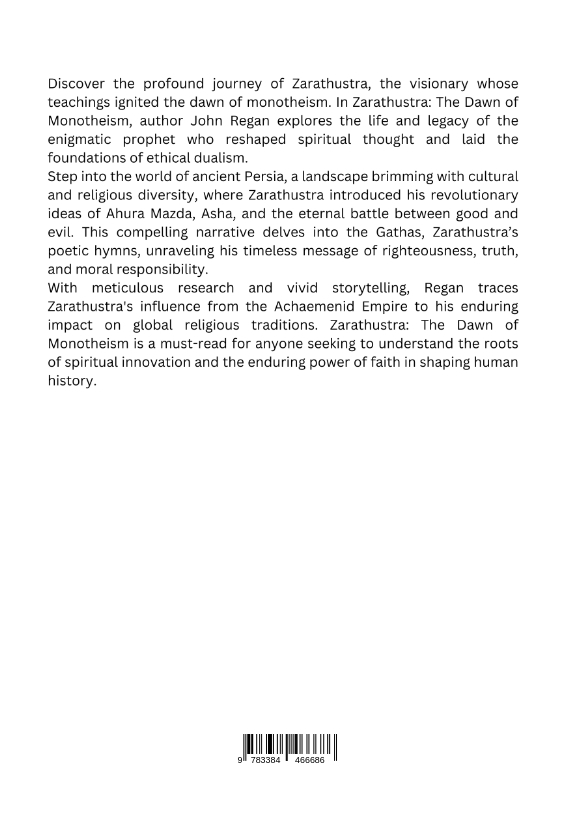 Discover the profound journey of Zarathustra, the visionary whose teachings ignited the dawn of monotheism. In Zarathustra: The Dawn of Monotheism, author John Regan explores the life and legacy of the enigmatic prophet who reshaped spiritual thought and laid the foundations of ethical dualism.Step into the world of ancient Persia, a landscape brimming with cultural and religious diversity, where Zarathustra introduced his revolutionary ideas of Ahura Mazda, Asha, and the eternal battle between good and evil. This compelling narrative delves into the Gathas, Zarathustra's poetic hymns, unraveling his timeless message of righteousness, truth, and moral responsibility.With meticulous research and vivid storytelling, Regan traces Zarathustra's influence from the Achaemenid Empire to his enduring impact on global religious traditions. Zarathustra: The Dawn of Monotheism is a mustread for anyone seeking to understand the roots of spiritual innovation and the enduring power of faith in shaping human history.