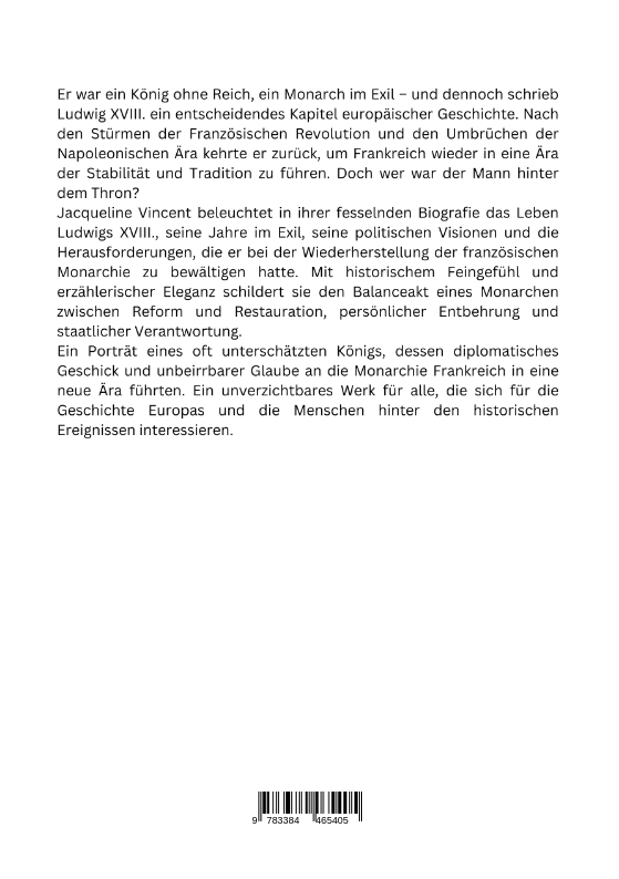 | Schlagworte | Bourbonen-Dynastie • Französische Revolution • Historische Biografie • König Frankreichs • König im Exil • Königlicher Wiederaufbau • Ludwig XVIII. • Monarchie Restauration • Revolution und Monarchie |