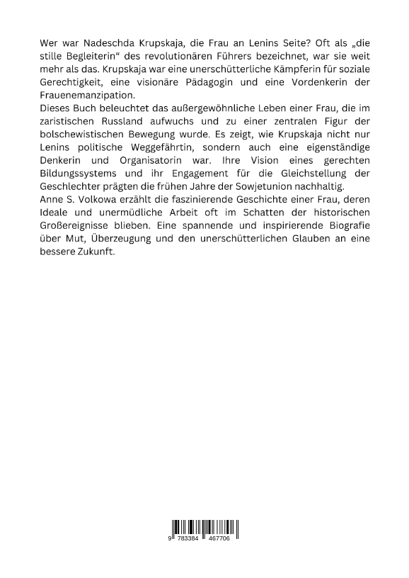 Wer war Nadeschda Krupskaja, die Frau an Lenins Seite? Oft als "die stille Begleiterin" des revolutionären Führers bezeichnet, war sie weit mehr als das. Krupskaja war eine unerschütterliche Kämpferin für soziale Gerechtigkeit, eine visionäre Pädagogin und eine Vordenkerin der Frauenemanzipation.Dieses Buch beleuchtet das außergewöhnliche Leben einer Frau, die im zaristischen Russland aufwuchs und zu einer zentralen Figur der bolschewistischen Bewegung wurde. Es zeigt, wie Krupskaja nicht nur Lenins politische Weggefährtin, sondern auch eine eigenständige Denkerin und Organisatorin war. Ihre Vision eines gerechten Bildungssystems und ihr Engagement für die Gleichstellung der Geschlechter prägten die frühen Jahre der Sowjetunion nachhaltig.Anne S. Volkowa erzählt die faszinierende Geschichte einer Frau, deren Ideale und unermüdliche Arbeit oft im Schatten der historischen Großereignisse blieben. Eine spannende und inspirierende Biografie über Mut, Überzeugung und den unerschütterlichen Glauben an eine bessere Zukunft.