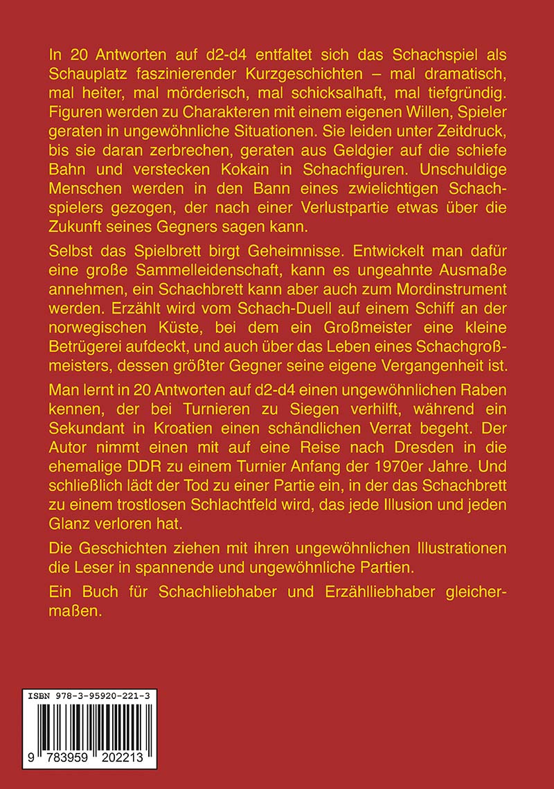 Man lernt in 20 Antworten auf d2-d4 einen ungewöhnlichen Raben kennen, der bei Turnieren zu Siegen verhilft, während ein Sekundant in Kroatien einen schändlichen Verrat begeht. Der Autor nimmt einen mit auf eine Reise nach Dresden in die ehemalige DDR zu einem Turnier Anfang der 1970er Jahre. Und schließlich lädt der Tod zu einer Partie ein, in der das Schachbrett zu einem trostlosen Schlachtfeld wird, das jede Illusion und jeden Glanz verloren hat.