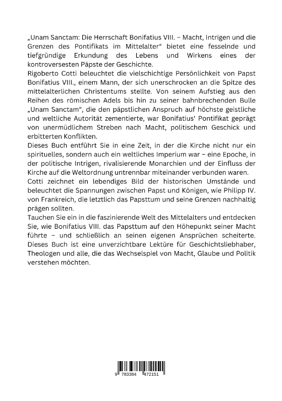 "Unam Sanctam: Die Herrschaft Bonifatius VIII. - Macht, Intrigen und die Grenzen des Pontifikats im Mittelalter" bietet eine fesselnde und tiefgründige Erkundung des Lebens und Wirkens eines der kontroversesten Päpste der Geschichte.Rigoberto Cotti beleuchtet die vielschichtige Persönlichkeit von Papst Bonifatius VIII., einem Mann, der sich unerschrocken an die Spitze des mittelalterlichen Christentums stellte. Von seinem Aufstieg aus den Reihen des römischen Adels bis hin zu seiner bahnbrechenden Bulle "Unam Sanctam", die den päpstlichen Anspruch auf höchste geistliche und weltliche Autorität zementierte, war Bonifatius' Pontifikat geprägt von unermüdlichem Streben nach Macht, politischem Geschick und erbitterten Konflikten.Dieses Buch entführt Sie in eine Zeit, in der die Kirche nicht nur ein spirituelles, sondern auch ein weltliches Imperium war - eine Epoche, in der politische Intrigen, rivalisierende Monarchien und der Einfluss der Kirche auf die Weltordnung untrennbar miteinander verbunden waren.Cotti zeichnet ein lebendiges Bild der historischen Umstände und beleuchtet die Spannungen zwischen Papst und Königen, wie Philipp IV. von Frankreich, die letztlich das Papsttum und seine Grenzen nachhaltig prägen sollten.Tauchen Sie ein in die faszinierende Welt des Mittelalters und entdecken Sie, wie Bonifatius VIII. das Papsttum auf den Höhepunkt seiner Macht führte - und schließlich an seinen eigenen Ansprüchen scheiterte. Dieses Buch ist eine unverzichtbare Lektüre für Geschichtsliebhaber, Theologen und alle, die das Wechselspiel von Macht, Glaube und Politik verstehen möchten.Rigoberto Cotti präsentiert eine meisterhafte Biografie, die historische Genauigkeit mit erzählerischer Spannung verbindet und die Bedeutung von Bonifatius VIII. in der Ge-schichte der Kirche und Europas neu beleuchtet.