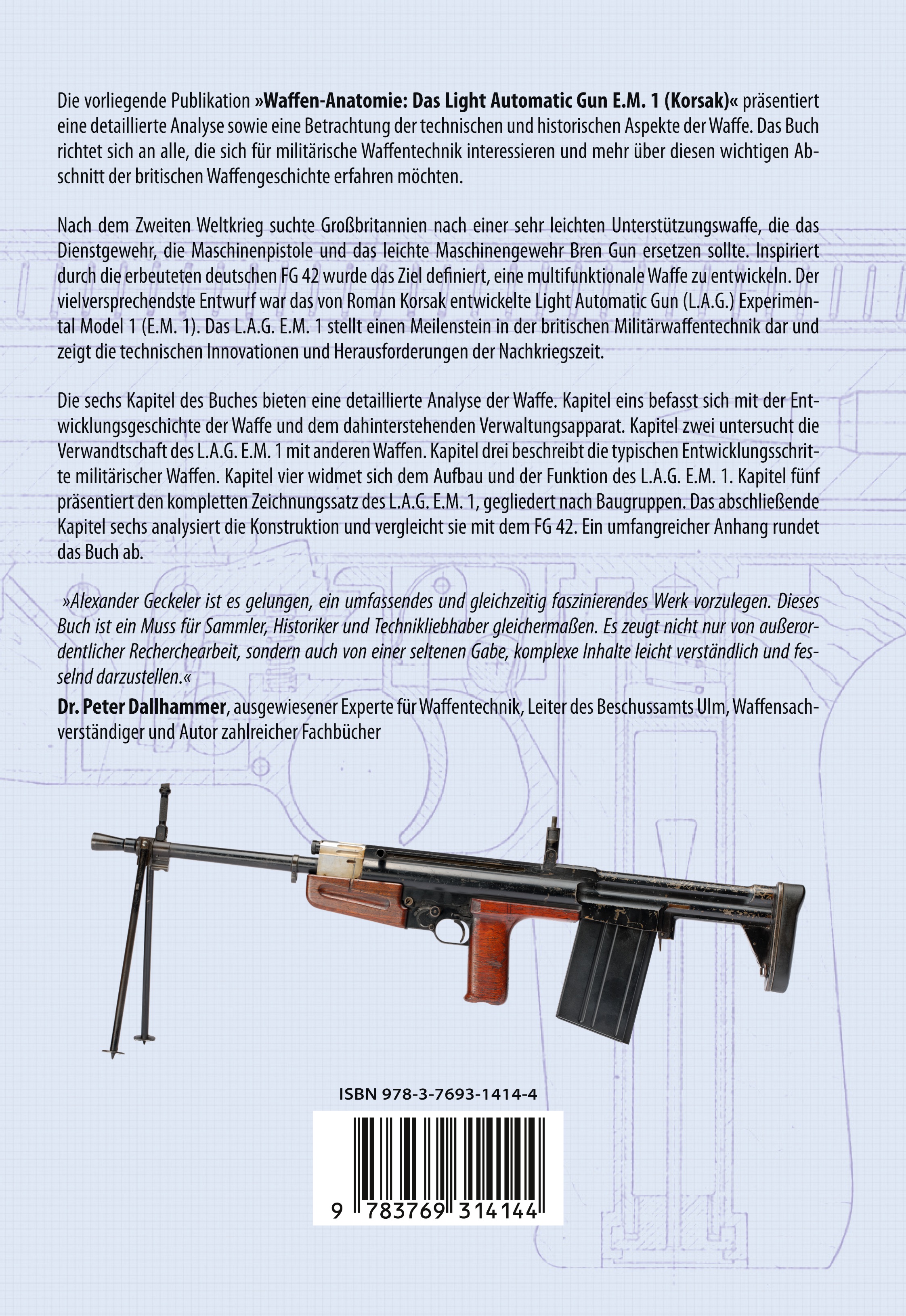 Die sechs Kapitel des Buches bieten eine detaillierte Analyse der Waffe. Kapitel eins befasst sich mit der Entwicklungsgeschichte der Waffe und dem dahinterstehenden Verwaltungsapparat. Kapitel zwei untersucht die Verwandtschaft des L.A.G. E.M. 1 mit anderen Waffen. Kapitel drei beschreibt die typischen Entwicklungsschritte militärischer Waffen. Kapitel vier widmet sich dem Aufbau und der Funktion des L.A.G. E.M. 1. Kapitel fünf präsentiert den kompletten Zeichnungssatz des L.A.G. E.M. 1, gegliedert nach Baugruppen. Das abschließende Kapitel sechs analysiert die Konstruktion und vergleicht sie mit dem FG 42. Ein umfangreicher Anhang rundet das Buch ab.