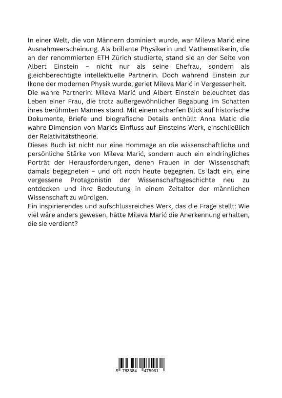 In einer Welt, die von Männern dominiert wurde, war Mileva Maric eine Ausnahmeerscheinung. Als brillante Physikerin und Mathematikerin, die an der renommierten ETH Zürich studierte, stand sie an der Seite von Albert Einstein - nicht nur als seine Ehefrau, sondern als gleichberechtigte intellektuelle Partnerin. Doch während Einstein zur Ikone der modernen Physik wurde, geriet Mileva Maric in Vergessenheit.Die wahre Partnerin: Mileva Maric und Albert Einstein beleuchtet das Leben einer Frau, die trotz außergewöhnlicher Begabung im Schatten ihres berühmten Mannes stand. Mit einem scharfen Blick auf historische Dokumente, Briefe und biografische Details enthüllt Anna Matic die wahre Dimension von Marics Einfluss auf Einsteins Werk, einschließlich der Relativitätstheorie.Dieses Buch ist nicht nur eine Hommage an die wissenschaftliche und persönliche Stärke von Mileva Maric, sondern auch ein eindringliches Porträt der Herausforderungen, denen Frauen in der Wissenschaft damals begegneten - und oft noch heute begegnen. Es lädt ein, eine vergessene Protagonistin der Wissenschaftsgeschichte neu zu entdecken und ihre Bedeutung in einem Zeitalter der männlichen Wissenschaft zu würdigen.Ein inspirierendes und aufschlussreiches Werk, das die Frage stellt: Wie viel wäre anders gewesen, hätte Mileva Maric die Anerkennung erhalten, die sie verdient?