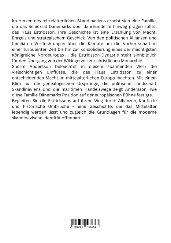 Im Herzen des mittelalterlichen Skandinaviens erhebt sich eine Familie, die das Schicksal Dänemarks über Jahrhunderte hinweg prägen sollte: das Haus Estridsson. Ihre Ge-schichte ist eine Erzählung von Macht, Ehrgeiz und strategischem Geschick. Von den politischen Allianzen und familiären Verflechtungen über die Kämpfe um die Vorherrschaft in einer turbulenten Zeit bis hin zur Konsolidierung eines der mächtigsten König-reiche Nordeuropas - die Estridsson-Dynastie steht sinnbildlich für den Übergang von der Wikingerzeit zur christlichen Monarchie.Snorre Andersson beleuchtet in diesem spannenden Werk die vielschichtigen Einflüsse, die das Haus Estridsson zu einer entscheidenden Macht im mittelalterlichen Europa machten. Mit einem Blick auf die genealogischen Ursprünge, die politische Landschaft Skandinaviens und die maritimen Handelswege zeigt Andersson, wie diese Familie Dänemarks Position auf der europäischen Bühne festigte.Begleiten Sie die Estridssons auf ihrem Weg durch Allianzen, Konflikte und historische Umbrüche - eine Geschichte, die das Mittelalter lebendig werden lässt und zugleich die Grundlagen für die moderne skandinavische Identität offenbart.