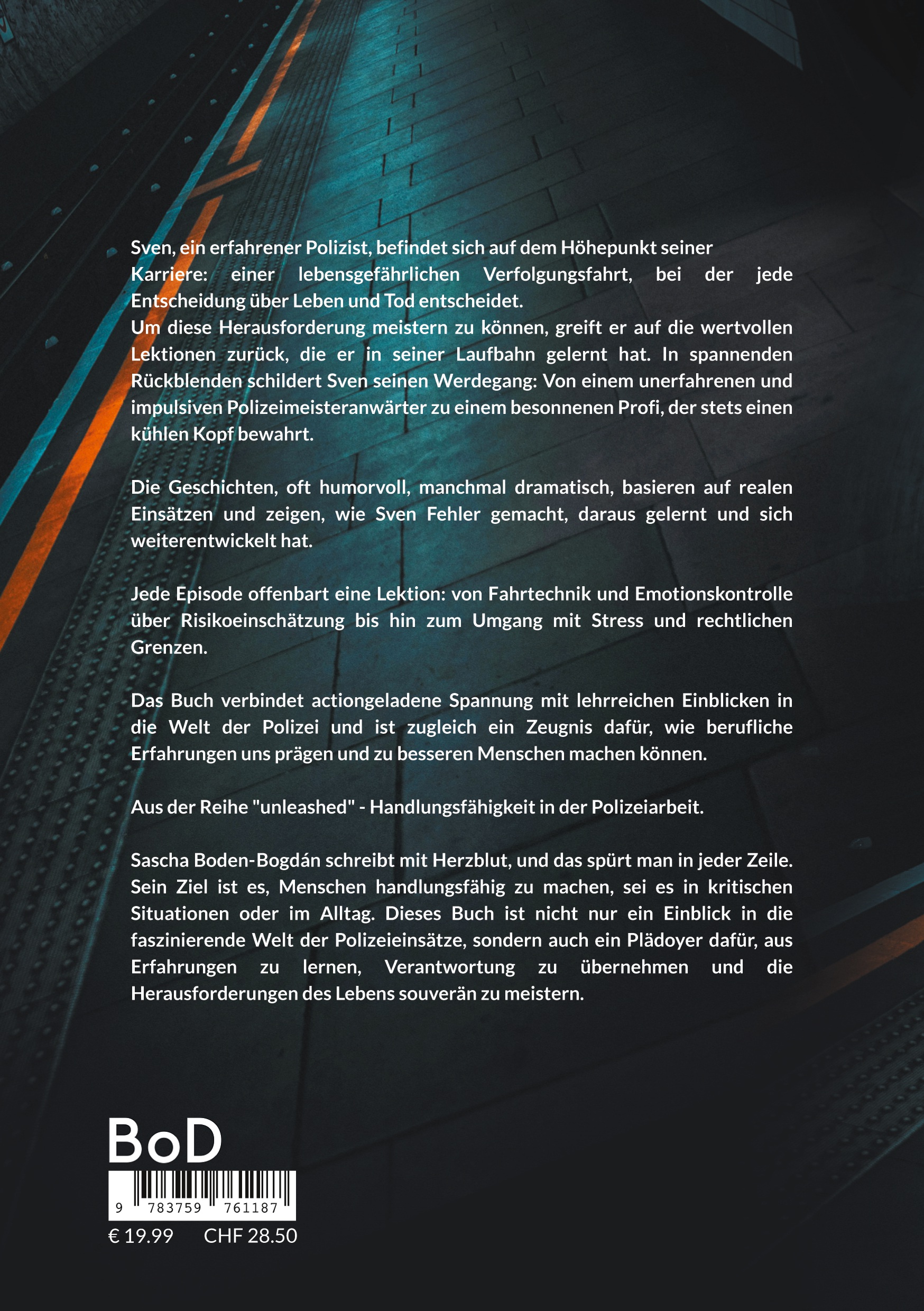Sascha Boden-Bogdán schreibt mit Herzblut, und das spürt man in jeder Zeile. Sein Ziel ist es, Menschen handlungsfähig zu machen, sei es in kritischen Situationen oder im Alltag. Dieses Buch ist nicht nur ein Einblick in die faszinierende Welt der Polizeieinsätze, sondern auch ein Plädoyer dafür, aus Erfahrungen zu lernen, Verantwortung zu übernehmen und die Herausforderungen des Lebens souverän zu meistern.