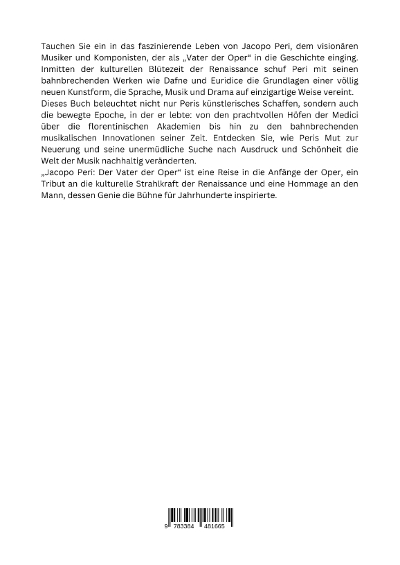 Tauchen Sie ein in das faszinierende Leben von Jacopo Peri, dem visionären Musiker und Komponisten, der als "Vater der Oper" in die Geschichte einging. Inmitten der kulturellen Blütezeit der Renaissance schuf Peri mit seinen bahnbrechenden Werken wie Dafne und Euridice die Grundlagen einer völlig neuen Kunstform, die Sprache, Musik und Drama auf einzigartige Weise vereint.Dieses Buch beleuchtet nicht nur Peris künstlerisches Schaffen, sondern auch die bewegte Epoche, in der er lebte: von den prachtvollen Höfen der Medici über die florentinischen Akademien bis hin zu den bahnbrechenden musikalischen Innovationen seiner Zeit. Entdecken Sie, wie Peris Mut zur Neuerung und seine unermüdliche Suche nach Ausdruck und Schönheit die Welt der Musik nachhaltig veränderten."Jacopo Peri: Der Vater der Oper" ist eine Reise in die Anfänge der Oper, ein Tribut an die kulturelle Strahlkraft der Renaissance und eine Hommage an den Mann, dessen Genie die Bühne für Jahrhunderte inspirierte.