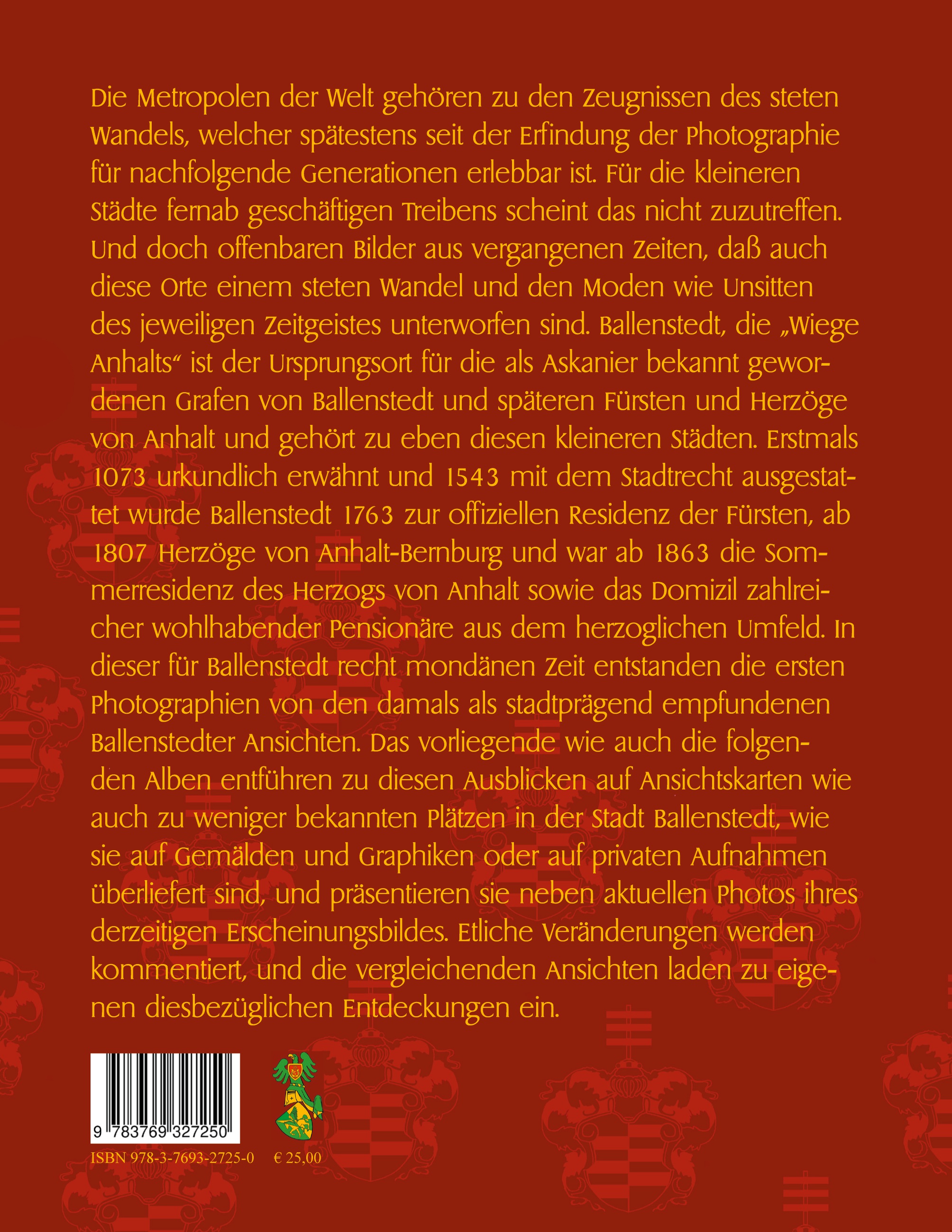Auch die kleineren Städte wie Ballenstedt, die einstige Residenz der Fürsten und Herzöge von Anhalt, unterliegen einem ständigen Wandel, der seit dem 19. Jahrhundert auch in Photographien nachvollziehbar ist. Alte und neue Aufnahmen aus der Stadt werden in diesem Bildband in direktem Vergleich nebeneinander gestellt und kommentiert. Sie laden zu eigenen Entdeckungen von Beständigkeit und Veränderung ein.