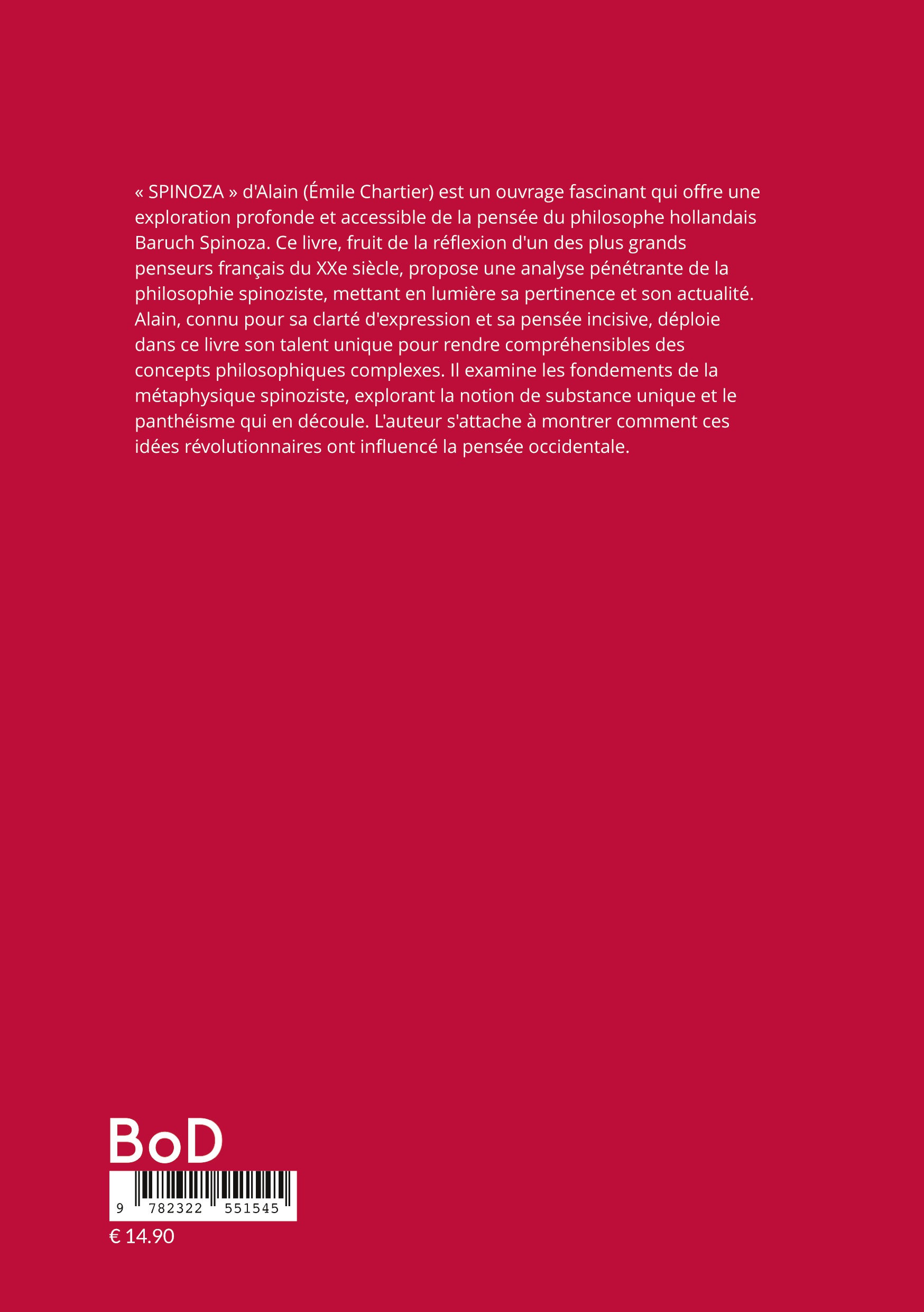 Alain, connu pour sa clarté d'expression et sa pensée incisive, déploie dans ce livre son talent unique pour rendre compréhensibles des concepts philosophiques complexes. Il examine les fondements de la métaphysique spinoziste, explorant la notion de substance unique et le panthéisme qui en découle. L'auteur s'attache à montrer comment ces idées révolutionnaires ont influencé la pensée occidentale.