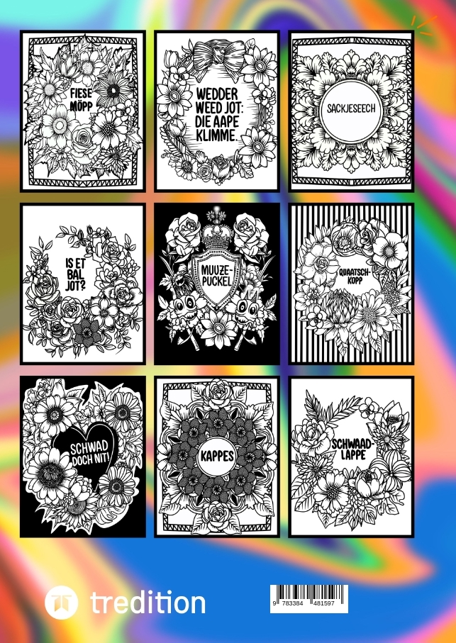 In diesem Malbuch werden kölsche "Schängeleerswööder" - also Schimpfwörter - von schönen Blumenkränzen umrahmt und zum Ausmalen dargeboten. Es enthält 15 Motive, die von Hand gezeichnet wurden und darauf warten, ausgemalt zu werden. Anschließend machen sich die farbenfrohen Kunstwerke auch wunderbar in einem Rahmen an der Wand.Für die richtige Schreibweise der "Schängeleerswööder" wird keine Garantie übernommen - alles wurde nach bestem Wissen und Gewissen gestaltet.