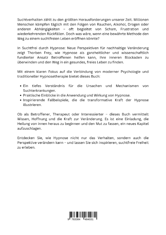 Suchtverhalten zählt zu den größten Herausforderungen unserer Zeit. Millionen Menschen kämpfen täglich mit den Folgen von Rauchen, Alkohol, Drogen oder anderen Abhängigkeiten - oft begleitet von Scham, Frustration und wiederkehrenden Rückfällen. Doch was wäre, wenn eine bewährte Methode den Weg zu einem suchtfreien Leben eröffnen könnte?In Suchtfrei durch Hypnose: Neue Perspektiven für nachhaltige Veränderung zeigt Thorben Frey, wie Hypnose als ganzheitlicher und wissenschaftlich fundierter Ansatz Betroffenen helfen kann, ihre inneren Blockaden zu überwinden und den Weg in ein gesundes, freies Leben zu finden.Mit einem klaren Fokus auf die Verbindung von moderner Psychologie und traditioneller Hypnosetherapie bietet dieses Buch:Ein tiefes Verständnis für die Ursachen und Mechanismen von Suchterkrankungen.Praktische Einblicke in die Anwendung und Wirkung von Hypnose.Inspirierende Fallbeispiele, die die transformative Kraft der Hypnose illustrieren.Ob als Betroffener, Therapeut oder Interessierter - dieses Buch vermittelt Wissen, Hoffnung und die Kraft zur Veränderung. Es ist eine Einladung, die Heilung von innen heraus zu beginnen und den Mut zu fassen, ein neues Kapitel aufzuschlagen.Entdecken Sie, wie Hypnose nicht nur das Verhalten, sondern auch die Perspektive verändern kann - und lassen Sie sich inspirieren, suchtfreie Freiheit zu erleben.