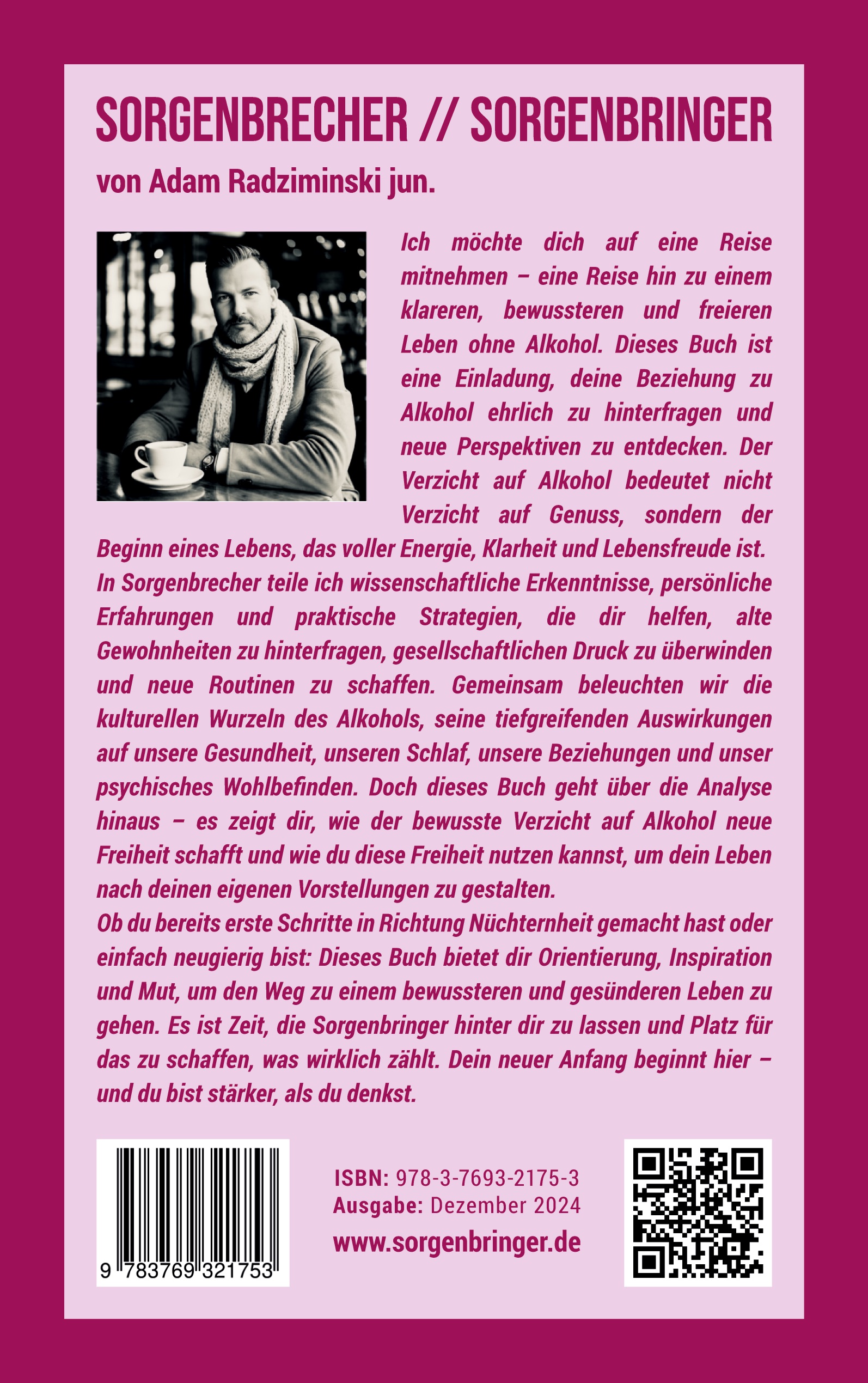 Adam Radziminski jun. ist Autor von Sachbüchern und Ratgebern auf dem Gebiet der Persönlichkeitsentwicklung. Mit seiner Arbeit an diesem Buch möchte er Menschen dabei unterstützen, ein gesünderes und erfüllteres Leben zu führen - frei von den Belastungen des Alkohols. Aus eigener Erfahrung weiss er, wie herausfordernd der Weg zur Nüchternheit sein kann, und teilt in seinem Buch wissenschaftliche Erkenntnisse, persönliche Einblicke und praktische Hilfestellungen. Der Autor legt besonderen Wert darauf, schwierige Themen wie Sucht und Abhängigkeit ohne Vorurteile oder moralische Wertungen zu behandeln. Sein Schreibstil ist einfühlsam, klar und motivierend, und seine Botschaft inspiriert Menschen, sich selbst und ihre Beziehungen neu zu entdecken. Mit "Sorgenbrecher // Sorgenbringer - Promillelos in ein erfüllteres und gesünderes Leben" liefert er ein wertvolles Werk für alle, die ihren Umgang mit Alkohol überdenken möchten - sei es für sich selbst, für Angehörige oder im Rahmen ihres Berufsalltags.