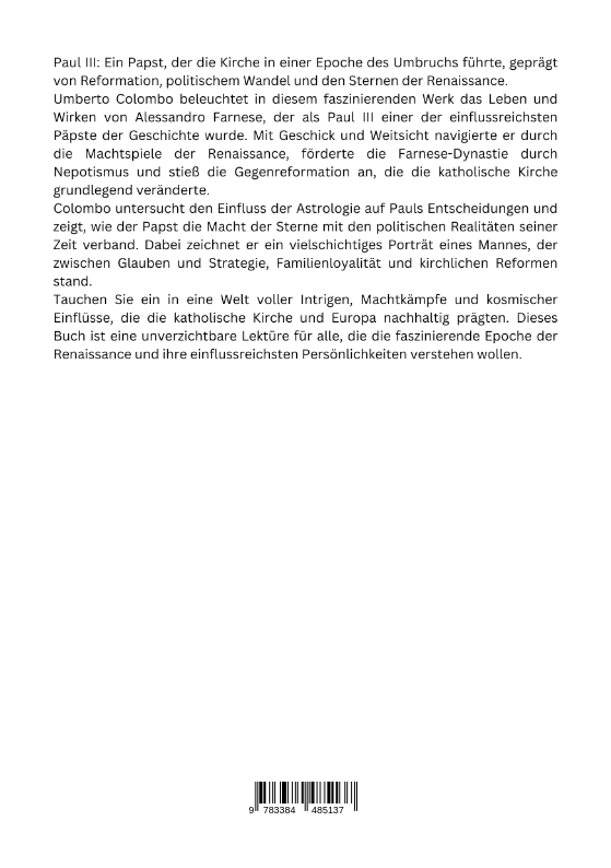 Paul III: Ein Papst, der die Kirche in einer Epoche des Umbruchs führte, geprägt von Re-formation, politischem Wandel und den Sternen der Renaissance.Umberto Colombo beleuchtet in diesem faszinierenden Werk das Leben und Wirken von Alessandro Farnese, der als Paul III einer der einflussreichsten Päpste der Geschichte wurde. Mit Geschick und Weitsicht navigierte er durch die Machtspiele der Renaissance, förderte die Farnese-Dynastie durch Nepotismus und stieß die Gegenreformation an, die die katholische Kirche grundlegend veränderte.Colombo untersucht den Einfluss der Astrologie auf Pauls Entscheidungen und zeigt, wie der Papst die Macht der Sterne mit den politischen Realitäten seiner Zeit verband. Dabei zeichnet er ein vielschichtiges Porträt eines Mannes, der zwischen Glauben und Strategie, Familienloyalität und kirchlichen Reformen stand.Tauchen Sie ein in eine Welt voller Intrigen, Machtkämpfe und kosmischer Einflüsse, die die katholische Kirche und Europa nachhaltig prägten. Dieses Buch ist eine unverzicht-bare Lektüre für alle, die die faszinierende Epoche der Renaissance und ihre einfluss-reichsten Persönlichkeiten verstehen wollen.