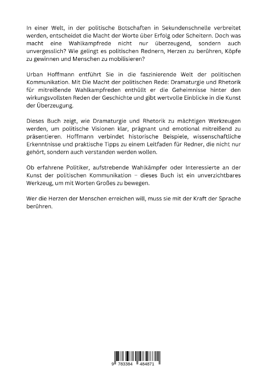 In einer Welt, in der politische Botschaften in Sekundenschnelle verbreitet werden, entscheidet die Macht der Worte über Erfolg oder Scheitern. Doch was macht eine Wahlkampfrede nicht nur überzeugend, sondern auch unvergesslich? Wie gelingt es politischen Rednern, Herzen zu berühren, Köpfe zu gewinnen und Menschen zu mobilisieren?Urban Hoffmann entführt Sie in die faszinierende Welt der politischen Kommunikation. Mit Die Macht der politischen Rede: Dramaturgie und Rhetorik für mitreißende Wahlkampfreden enthüllt er die Geheimnisse hinter den wirkungsvollsten Reden der Geschichte und gibt wertvolle Einblicke in die Kunst der Überzeugung.Dieses Buch zeigt, wie Dramaturgie und Rhetorik zu mächtigen Werkzeugen werden, um politische Visionen klar, prägnant und emotional mitreißend zu präsentieren. Hoffmann verbindet historische Beispiele, wissenschaftliche Erkenntnisse und praktische Tipps zu einem Leitfaden für Redner, die nicht nur gehört, sondern auch verstanden werden wollen.Ob erfahrene Politiker, aufstrebende Wahlkämpfer oder Interessierte an der Kunst der politischen Kommunikation - dieses Buch ist ein unverzichtbares Werkzeug, um mit Worten Großes zu bewegen.Wer die Herzen der Menschen erreichen will, muss sie mit der Kraft der Sprache berühren.