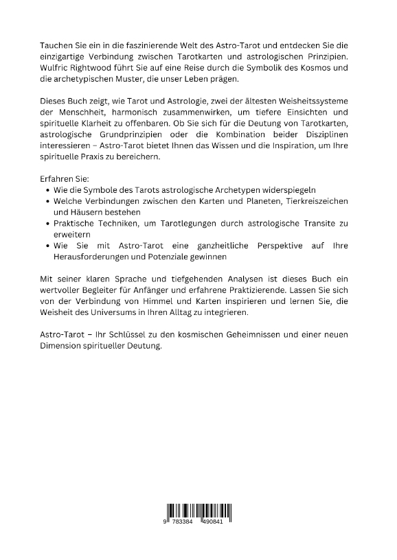Tauchen Sie ein in die faszinierende Welt des Astro-Tarot und entdecken Sie die einzigartige Verbindung zwischen Tarotkarten und astrologischen Prinzipien. Wulfric Rightwood führt Sie auf eine Reise durch die Symbolik des Kosmos und die archetypischen Muster, die unser Leben prägen.Dieses Buch zeigt, wie Tarot und Astrologie, zwei der ältesten Weisheitssysteme der Menschheit, harmonisch zusammenwirken, um tiefere Einsichten und spirituelle Klarheit zu offenbaren. Ob Sie sich für die Deutung von Tarotkarten, astrologische Grundprinzipien oder die Kombination beider Disziplinen interessieren - Astro-Tarot bietet Ihnen das Wissen und die Inspiration, um Ihre spirituelle Praxis zu bereichern.Erfahren Sie:Wie die Symbole des Tarots astrologische Archetypen widerspiegelnWelche Verbindungen zwischen den Karten und Planeten, Tierkreiszeichen und Häusern bestehenPraktische Techniken, um Tarotlegungen durch astrologische Transite zu erweiternWie Sie mit Astro-Tarot eine ganzheitliche Perspektive auf Ihre Herausforderungen und Potenziale gewinnenMit seiner klaren Sprache und tiefgehenden Analysen ist dieses Buch ein wertvoller Begleiter für Anfänger und erfahrene Praktizierende. Lassen Sie sich von der Verbindung von Himmel und Karten inspirieren und lernen Sie, die Weisheit des Universums in Ihren Alltag zu integrieren.Astro-Tarot - Ihr Schlüssel zu den kosmischen Geheimnissen und einer neuen Dimension spiritueller Deutung.