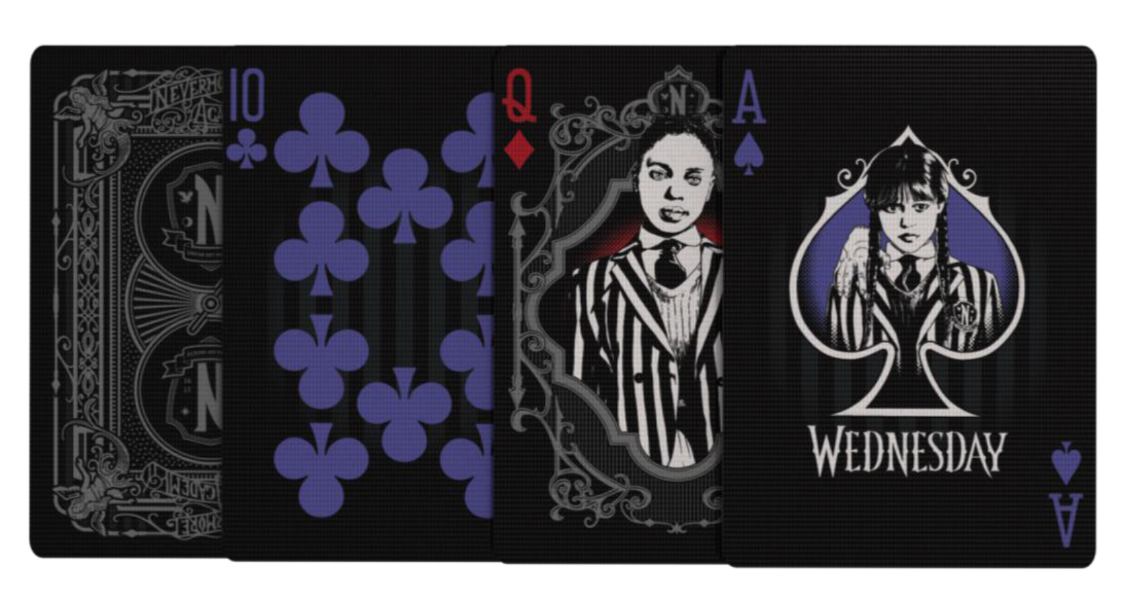 Exquisite Charakterkunst von Wednesday Addams, Enid Sinclair, Marilyn Thornhill und anderen geistert durch die Bildkarten. - Gruselige Kreaturen wie Spinnen, Piranhas, Raben und Rückrufe zur Show schmücken das Deck-Bicycles Luftpolster-Oberfläche für hervorragende Kartenhandhabung, Kartenmischung und Haltbarkeit-Hergestellt in den USA