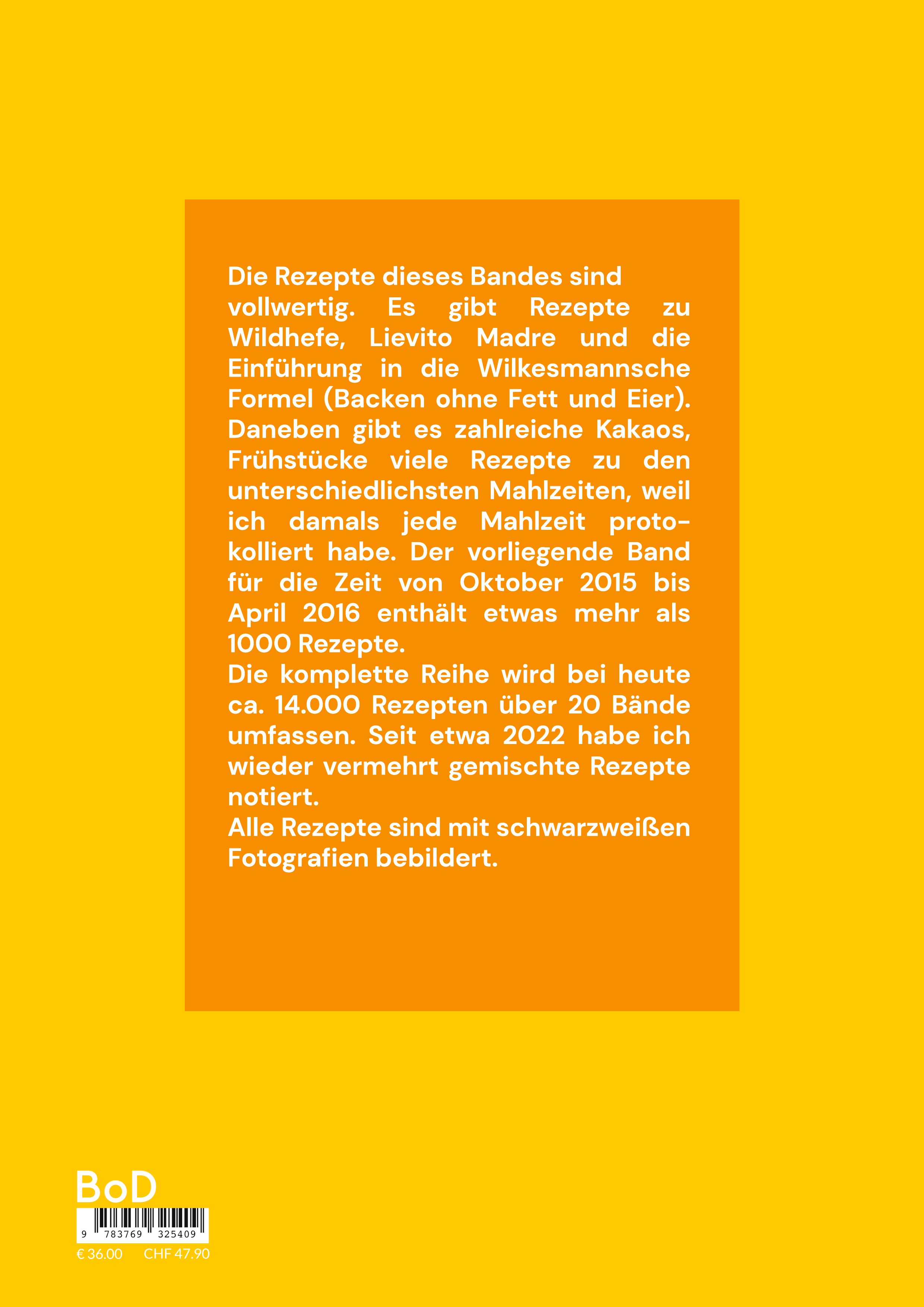 Die Rezepte dieses Bandes sind vollwertig. Es gibt Rezepte zu Wildhefe, Lievito Madre und die Einführung in die Wilkesmannsche Formel (Backen ohne Fett und Eier). Daneben gibt es zahlreiche Kakaos, Frühstücke viele Rezepte zu den unterschiedlichsten Mahlzeiten, weil ich damals jede Mahlzeit protokolliert habe. Der vorliegende Band für die Zeit von Oktober 2015 bis April 2016 enthält etwas mehr als 1000 Rezepte.