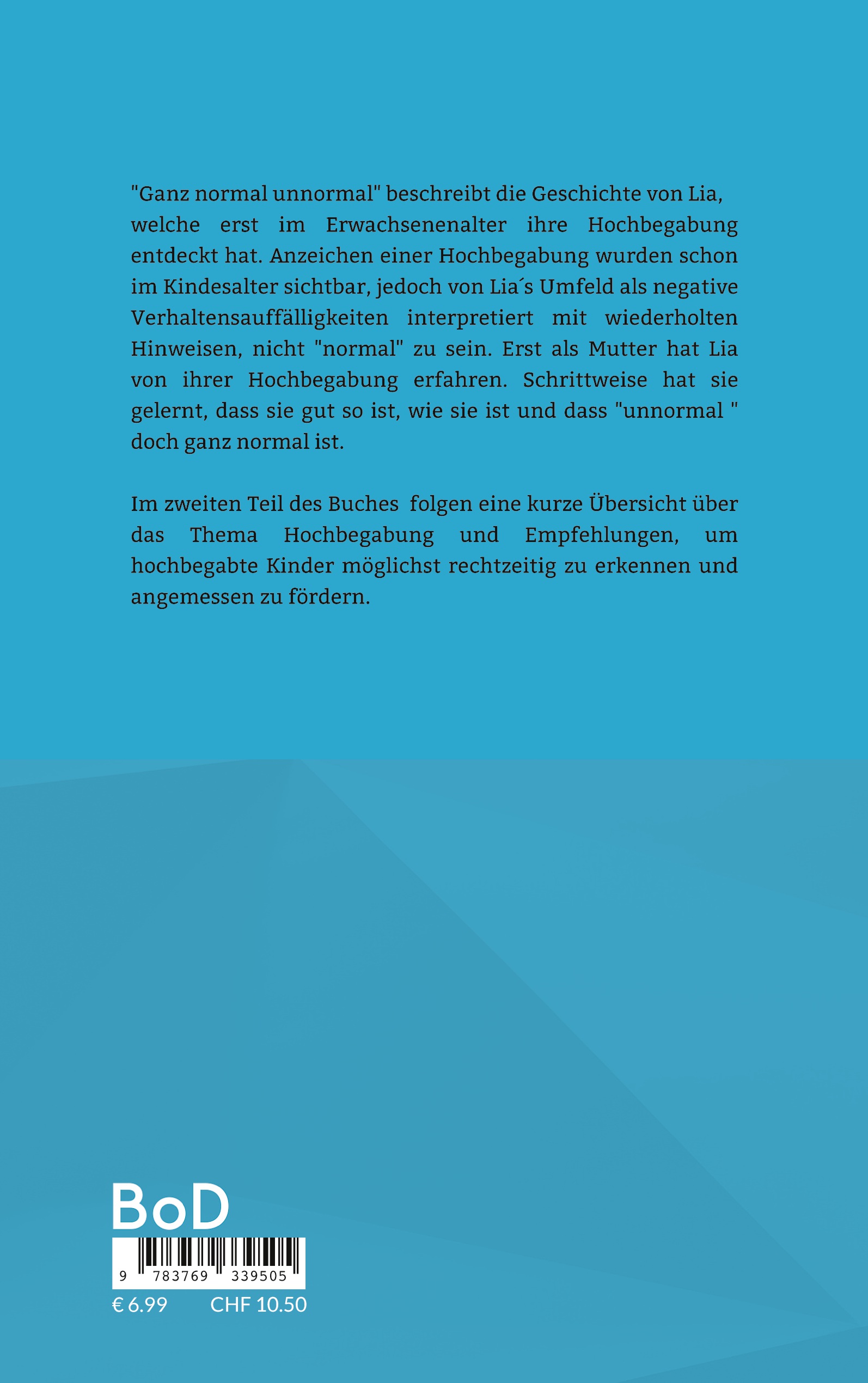 "Ganz normal unnormal" beschreibt die Geschichte von Lia, welche erst im Erwachsenenalter ihre Hochbegabung entdeckt hat. Anzeichen einer Hochbegabung wurden schon im Kindesalter sichtbar, jedoch von Lia´s Umfeld als negative Verhaltensauffälligkeiten interpretiert mit wiederholten Hinweisen, nicht "normal" zu sein. Erst als Mutter hat Lia von ihrer Hochbegabung erfahren. Schrittweise hat sie gelernt, dass sie gut so ist, wie sie ist und dass "unnormal" doch ganz normal ist.