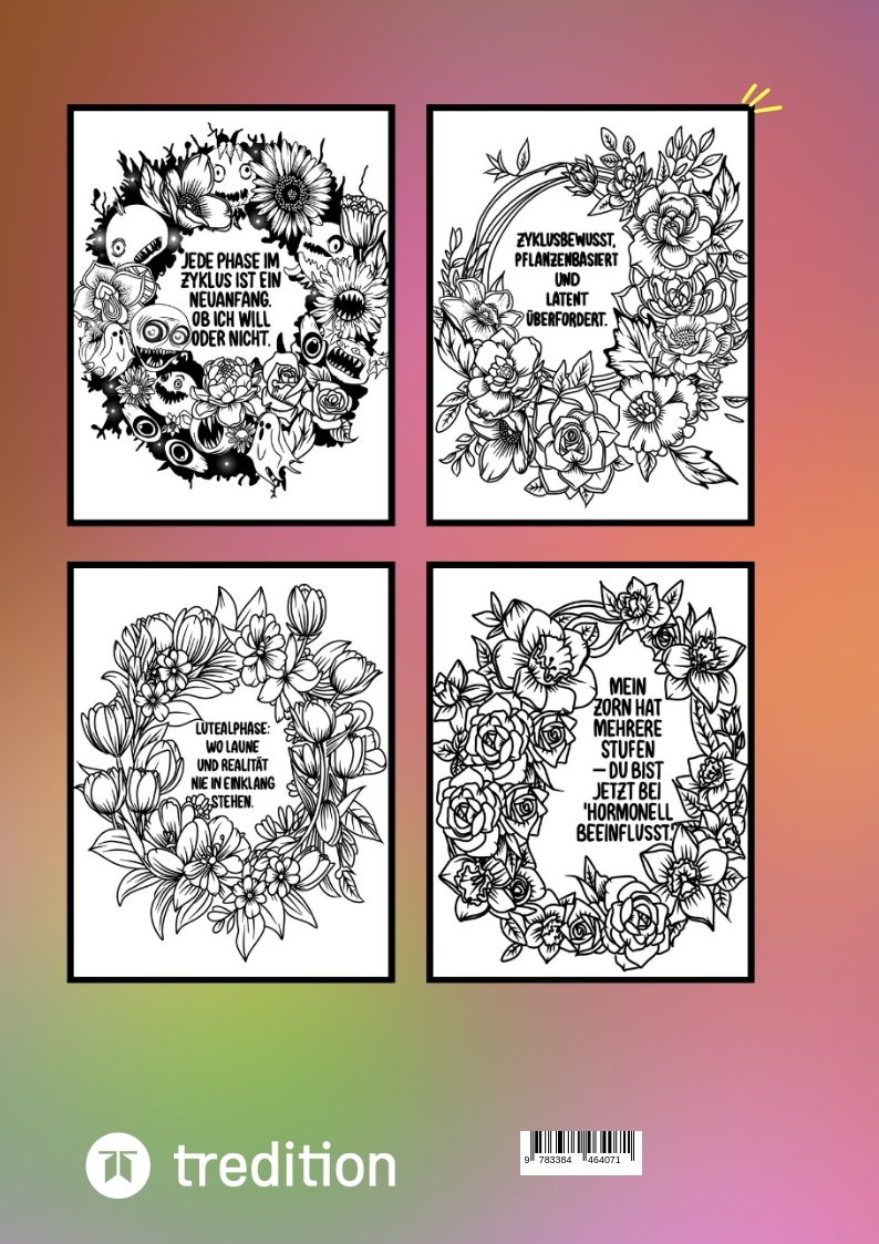 In diesem (sehr besonderen) Malbuch wird der weibliche Zyklus thematisiert und das was er bewirkt. Es gibt keine biologischen Beschreibungen, mehr emotionale Statements und das wichtigste Wort aus dem Bereich der "Selfcare" gleich 3x, nämlich 3x "Nein."