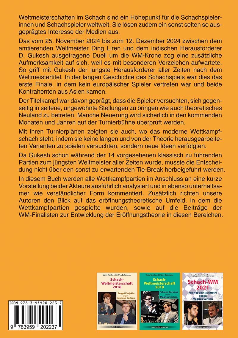 Weltmeisterschaften im Schach sind ein Höhepunkt für die Schachspieler- innen und Schachspieler weltweit. Sie lösen zudem ein sonst selten so ausgeprägtes Interesse der Medien aus.Das vom 25. November 2024 bis zum 12. Dezember 2024 zwischen dem amtierenden Weltmeister Ding Liren und dem indischen Herausforderer D. Gukesh ausgetragene Duell um die WM-Krone zog eine zusätzliche Aufmerksamkeit auf sich, weil es mit besonderen Vorzeichen aufwartete. So griff mit Gukesh der jüngste Herausforderer aller Zeiten nach dem Weltmeistertitel. In der langen Geschichte des Schachspiels war dies das erste Finale, in dem kein europäischer Spieler vertreten war und beide Kontrahenten aus Asien kamen.Der Titelkampf war davon geprägt, dass die Spieler versuchten, sich gegenseitig in seltene, ungewohnte Stellungen zu bringen wie auch theoretisches Neuland zu betreten. Manche Neuerung wird sicherlich in den kommenden Monaten und Jahren auf der Turnierbühne überprüft werden.Mit ihren Turnierplänen zeigten sie auch, wo das moderne Wettkampfschach steht, indem sie keine langen und von der Theorie herausgearbeiteten Varianten zu spielen versuchten, sondern neue Ideen verfolgten.Da Gukesh schon während der 14 vorgesehenen klassisch zu führenden Partien zum jüngsten Weltmeister aller Zeiten wurde, musste die Entscheidung nicht über den sonst zu erwartenden Tie-Break herbeigeführt werden.In diesem Buch werden alle Wettkampfpartien im Anschluss an eine kurze Vorstellung beider Akteure ausführlich analysiert und in ebenso unterhaltsamer wie verständlicher Form kommentiert. Zusätzlich richten unsere Autoren den Blick auf das eröffnungstheoretische Umfeld, in dem die Wettkampfpartien gespielte wurden, sowie auf die Beiträge der WM-Finalisten zur Entwicklung der Eröffnungstheorie in diesen Bereichen.