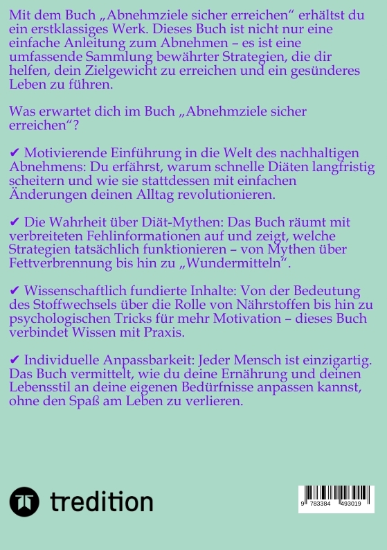 Im Buch "Abnehmen mit Erfolg" geht es darum, effektive Strategien und Methoden zu vermitteln, die Menschen dabei unterstützen, nachhaltig Gewicht zu verlieren und ihre Gesundheit zu verbessern. Das Buch bietet praktische Tipps zu Ernährung, Bewegung und Lebensstiländerungen, die helfen, ein gesundes Gewicht zu erreichen und zu halten.Es behandelt Themen wie die Bedeutung einer ausgewogenen Ernährung, die Auswahl gesunder Lebensmittel, die Planung von Mahlzeiten und die Integration von Bewegung in den Alltag. Zudem werden psychologische Aspekte des Abnehmens angesprochen, wie Motivation, Selbstdisziplin und der Umgang mit Rückschlägen.Das Ziel des Buches ist es, den Lesern zu zeigen, dass Abnehmen nicht nur eine kurzfristige Diät ist, sondern ein langfristiger Prozess, der mit der richtigen Einstellung und den passenden Werkzeugen erfolgreich gemeistert werden kann.