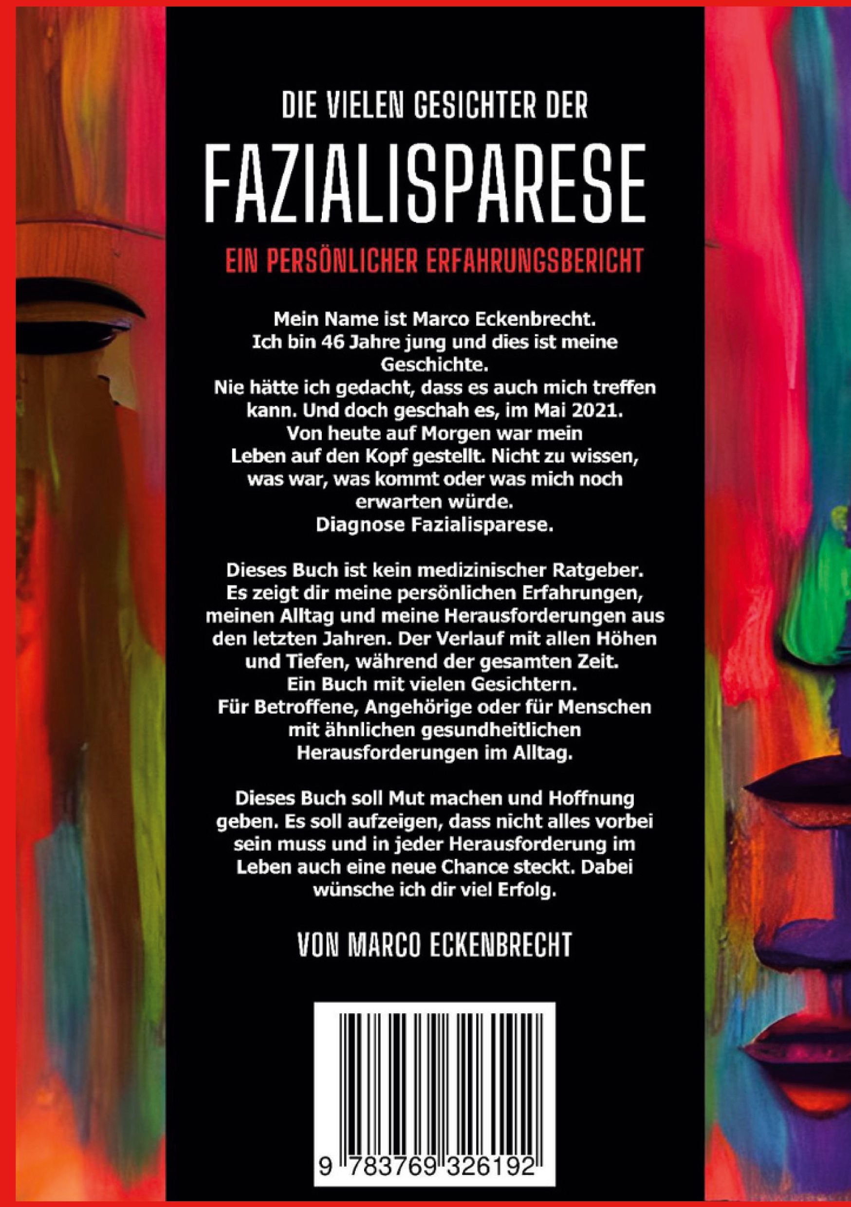 Die vielen Gesichter der Fazialisparese. Ein persönlicher Erfahrungsbericht von Marco Eckenbrecht. Es zeigt die Herausforderungen im Alltag und gibt einen Einblick in die Zeit vor, während und nach der Diagnose. Ein Buch voller Emotionen, Geschichten und ein Mutmacher für Menschen mit diesen oder ähnlichen Erfahrungen.