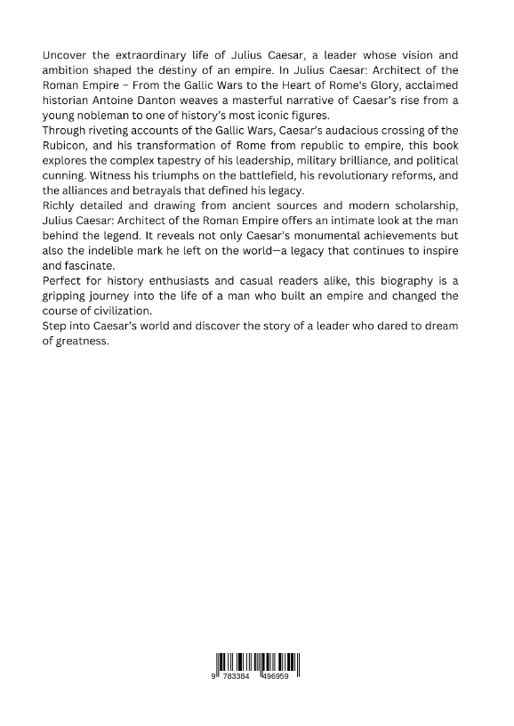 Uncover the extraordinary life of Julius Caesar, a leader whose vision and ambition shaped the destiny of an empire. In Julius Caesar: Architect of the Roman Empire - From the Gallic Wars to the Heart of Rome's Glory, acclaimed historian Antoine Danton weaves a masterful narrative of Caesar's rise from a young nobleman to one of history's most iconic figures.Through riveting accounts of the Gallic Wars, Caesar's audacious crossing of the Rubicon, and his transformation of Rome from republic to empire, this book explores the complex tapestry of his leadership, military brilliance, and political cunning. Witness his triumphs on the battlefield, his revolutionary reforms, and the alliances and betrayals that defined his legacy.Richly detailed and drawing from ancient sources and modern scholarship, Julius Caesar: Architect of the Roman Empire offers an intimate look at the man behind the legend. It reveals not only Caesar's monumental achievements but also the indelible mark he left on the world-a legacy that continues to inspire and fascinate.Perfect for history enthusiasts and casual readers alike, this biography is a gripping journey into the life of a man who built an empire and changed the course of civilization.Step into Caesar's world and discover the story of a leader who dared to dream of greatness.