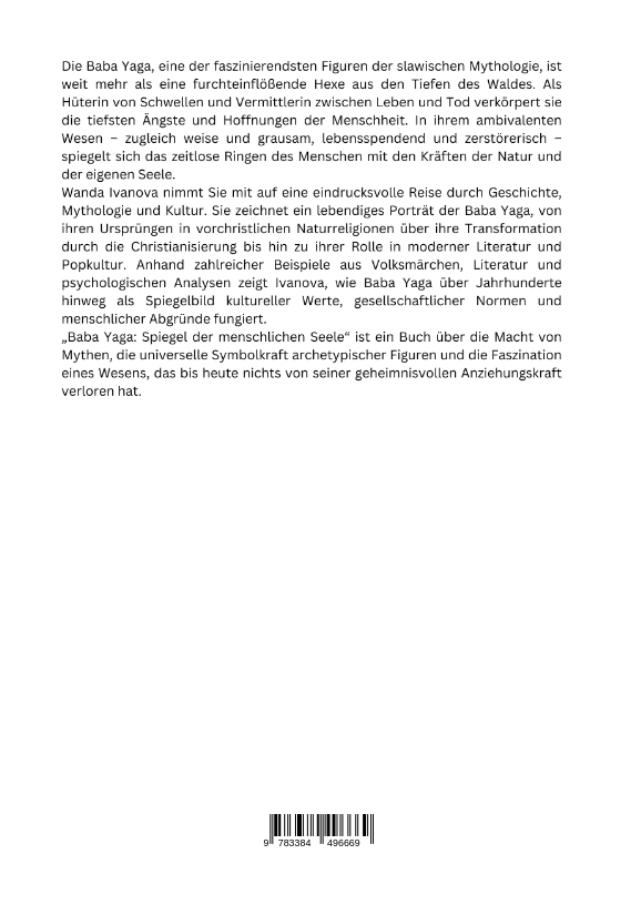 Die Baba Yaga, eine der faszinierendsten Figuren der slawischen Mythologie, ist weit mehr als eine furchteinflößende Hexe aus den Tiefen des Waldes. Als Hüterin von Schwellen und Vermittlerin zwischen Leben und Tod verkörpert sie die tiefsten Ängste und Hoffnungen der Menschheit. In ihrem ambivalenten Wesen - zugleich weise und grausam, lebensspendend und zerstörerisch - spiegelt sich das zeitlose Ringen des Menschen mit den Kräften der Natur und der eigenen Seele.Wanda Ivanova nimmt Sie mit auf eine eindrucksvolle Reise durch Geschichte, Mythologie und Kultur. Sie zeichnet ein lebendiges Porträt der Baba Yaga, von ihren Ursprüngen in vorchristlichen Naturreligionen über ihre Transformation durch die Christianisierung bis hin zu ihrer Rolle in moderner Literatur und Popkultur. Anhand zahlreicher Beispiele aus Volksmärchen, Literatur und psychologischen Analysen zeigt Ivanova, wie Baba Yaga über Jahrhunderte hinweg als Spiegelbild kultureller Werte, gesellschaftlicher Normen und menschlicher Abgründe fungiert."Baba Yaga: Spiegel der menschlichen Seele" ist ein Buch über die Macht von Mythen, die universelle Symbolkraft archetypischer Figuren und die Faszination eines Wesens, das bis heute nichts von seiner geheimnisvollen Anziehungskraft verloren hat.