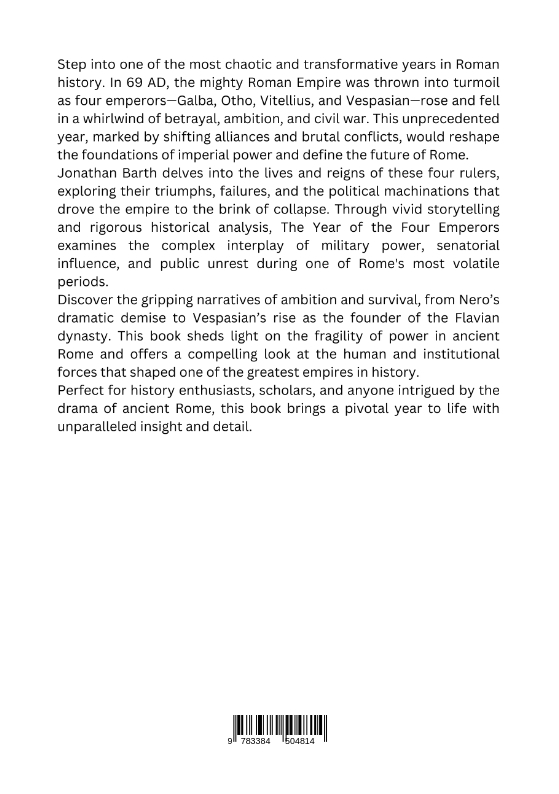 Step into one of the most chaotic and transformative years in Roman history. In 69 AD, the mighty Roman Empire was thrown into turmoil as four emperors-Galba, Otho, Vitellius, and Vespasian-rose and fell in a whirlwind of betrayal, ambition, and civil war. This unprecedented year, marked by shifting alliances and brutal conflicts, would reshape the foundations of imperial power and define the future of Rome.Jonathan Barth delves into the lives and reigns of these four rulers, exploring their triumphs, failures, and the political machinations that drove the empire to the brink of collapse. Through vivid storytelling and rigorous historical analysis, The Year of the Four Emperors examines the complex interplay of military power, senatorial influence, and public unrest during one of Rome's most volatile periods.Discover the gripping narratives of ambition and survival, from Nero's dramatic demise to Vespasian's rise as the founder of the Flavian dynasty. This book sheds light on the fragility of power in ancient Rome and offers a compelling look at the human and institutional forces that shaped one of the greatest empires in history.Perfect for history enthusiasts, scholars, and anyone intrigued by the drama of ancient Rome, this book brings a pivotal year to life with unparalleled insight and detail.